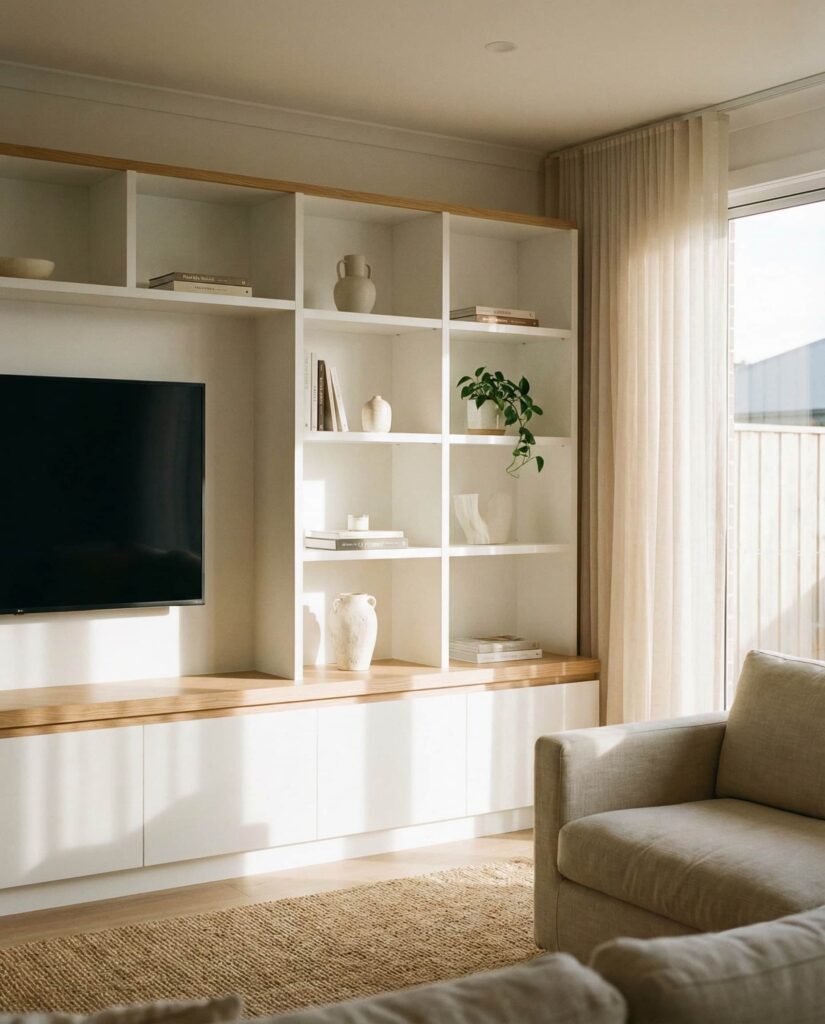 Designers increasingly plan shelves starting from how people actually sit and relax. Built-ins aligned with the Couch zone ensure shelves feel supportive rather than imposing. This approach often includes low shelving, space for a Tv, and layered Decorating that feels casual. I’ve noticed this layout works well in family homes where comfort drives design decisions, and shelves evolve over time as needs change.