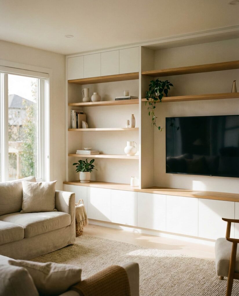 A growing trend is designing built-in shelves that balance a Tv wall with window placement, especially in living rooms where symmetry isn’t perfect. This idea uses shelving to visually connect the Window and screen so neither dominates. I’ve seen designers recommend slim White or light Wooden shelves that allow daylight to soften the tech-heavy zone. It works well in a Modern home where Decorating stays minimal and intentional. The shelves provide storage and styling space while keeping sightlines open, making the room feel calm and cohesive rather than divided.