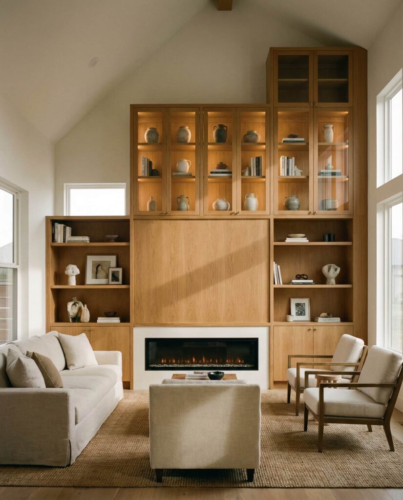 Homes with a Vaulted ceiling or Fireplace tall ceiling benefit most from shelves that go all the way up. Floor-to-ceiling built-ins emphasize architecture instead of fighting it. In my experience, homeowners are often nervous about scale, but once installed, these shelves make High ceilings feel grounded. Using Glass cabinet fronts on upper sections keeps the look light, while closed storage below handles daily clutter. This approach feels both Modern and practical, especially when paired with a streamlined Electric fireplace below.