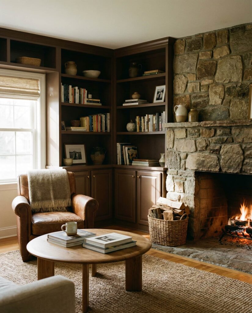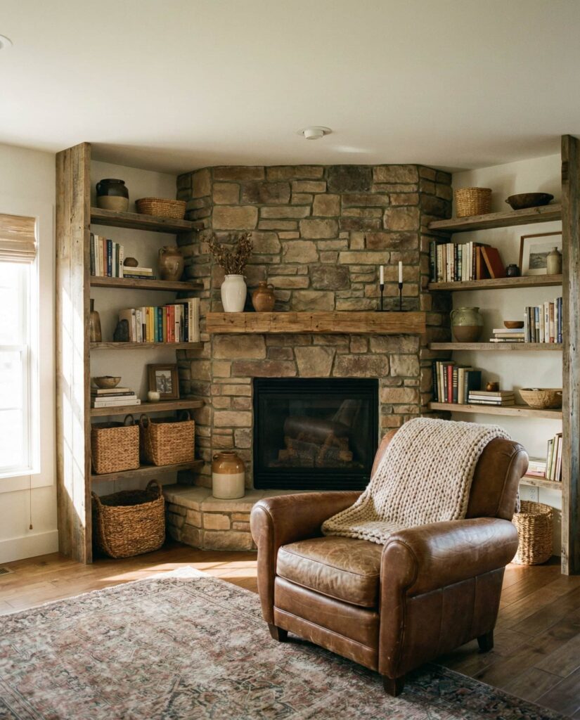 A Corner fireplace often challenges furniture placement, but built-ins solve this elegantly. Shelves wrapping a Corner fire unit create symmetry where none existed. In 2026, designers lean toward slim profiles and textured finishes rather than bulky cabinetry. I’ve seen this approach transform awkward layouts into cozy conversation areas, especially when paired with a sectional Couch angled toward the fire. A muted Rustic tone or soft Brown stain adds character without overpowering the room.