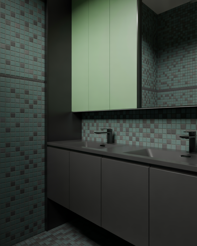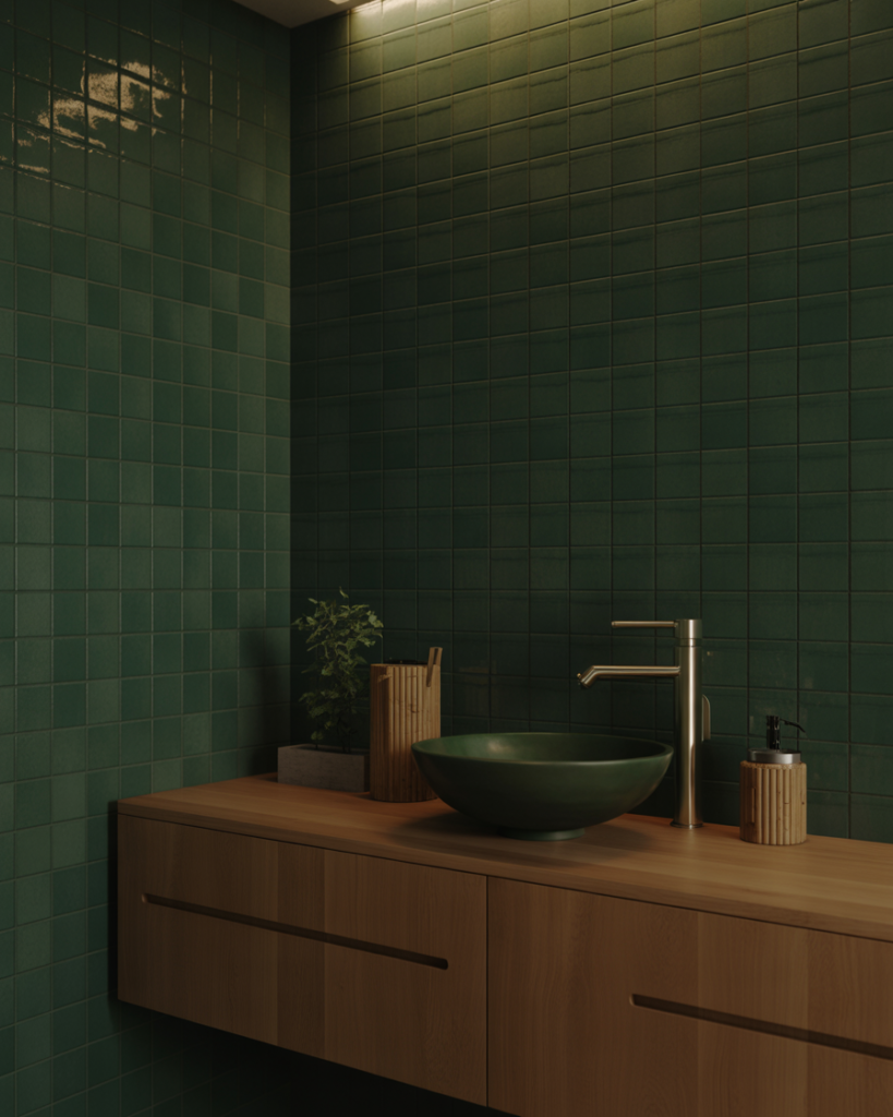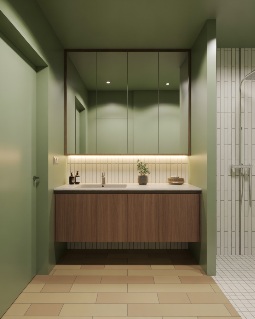 An Emerald green concept captures luxury with jewel-toned tiles, polished fixtures, and sleek floating cabinets. I once toured a model home where emerald walls transformed the shower into a jewel-box moment, proving bold color can still feel serene. This palette works best with simple silhouettes and uncluttered decor, offering high-end style without losing modern practicality.