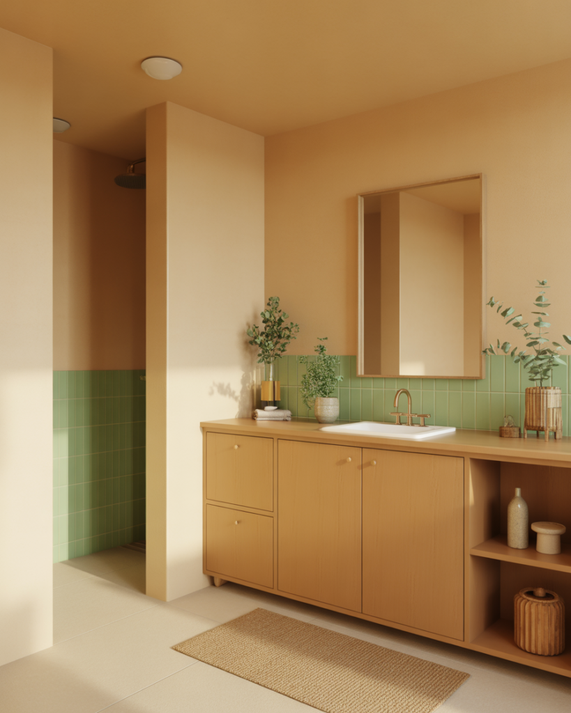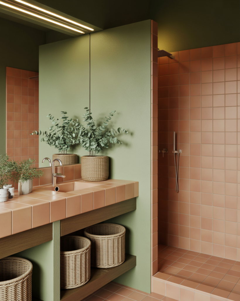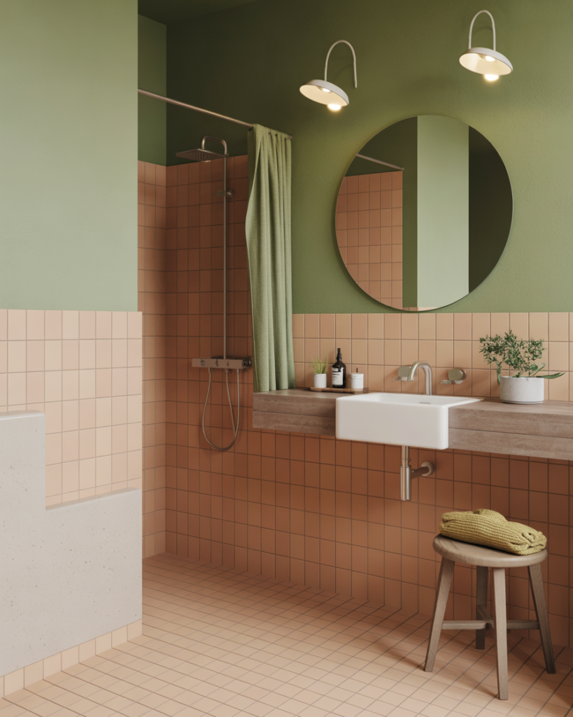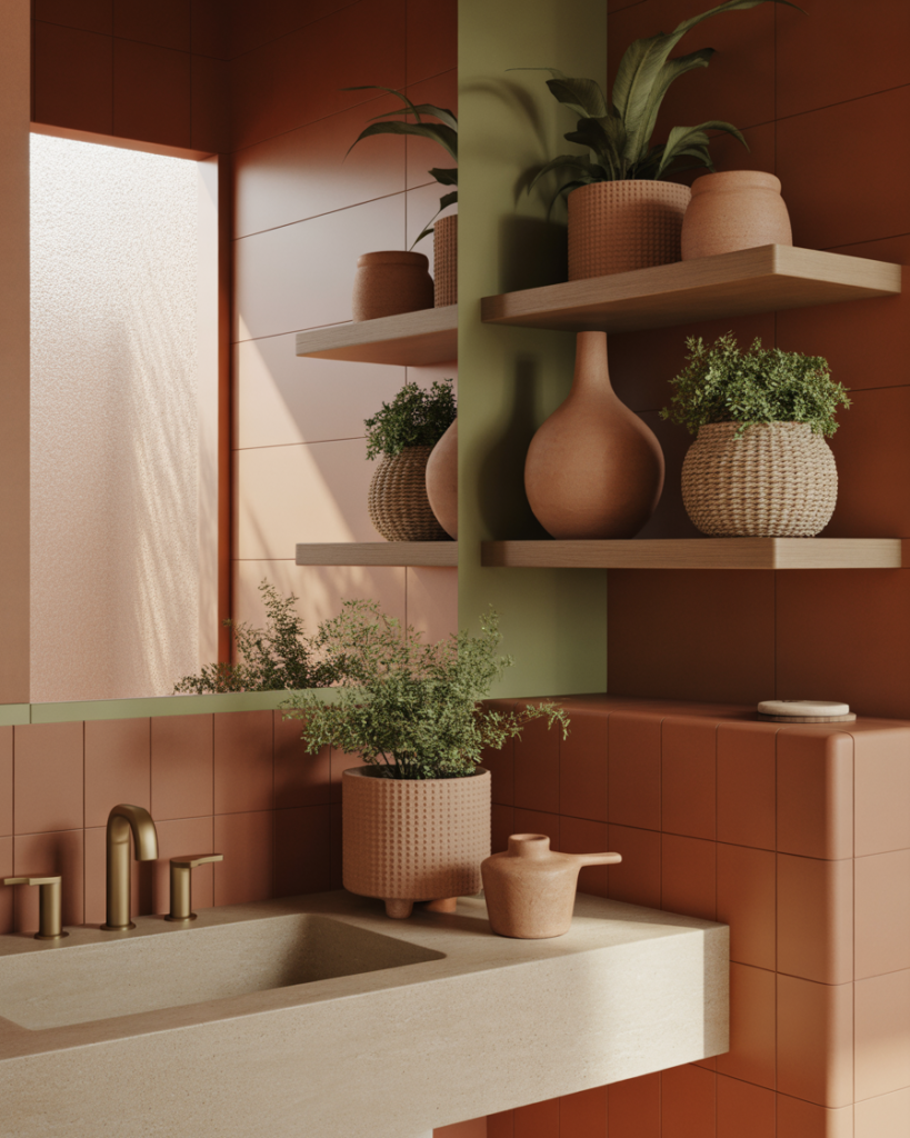 Instead of full color commitment, add Terracotta and green through accessories like clay decor, patterned towels, or minimal shelving. A stylist once told me terracotta brings “sunlight warmth” to cooler greens, and she wasn’t wrong. This combination softens stark modern aesthetic elements and fits casual, earthy bathroom concepts.