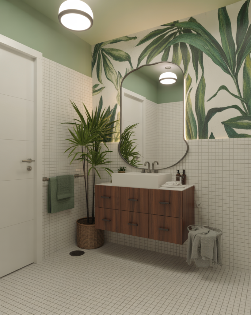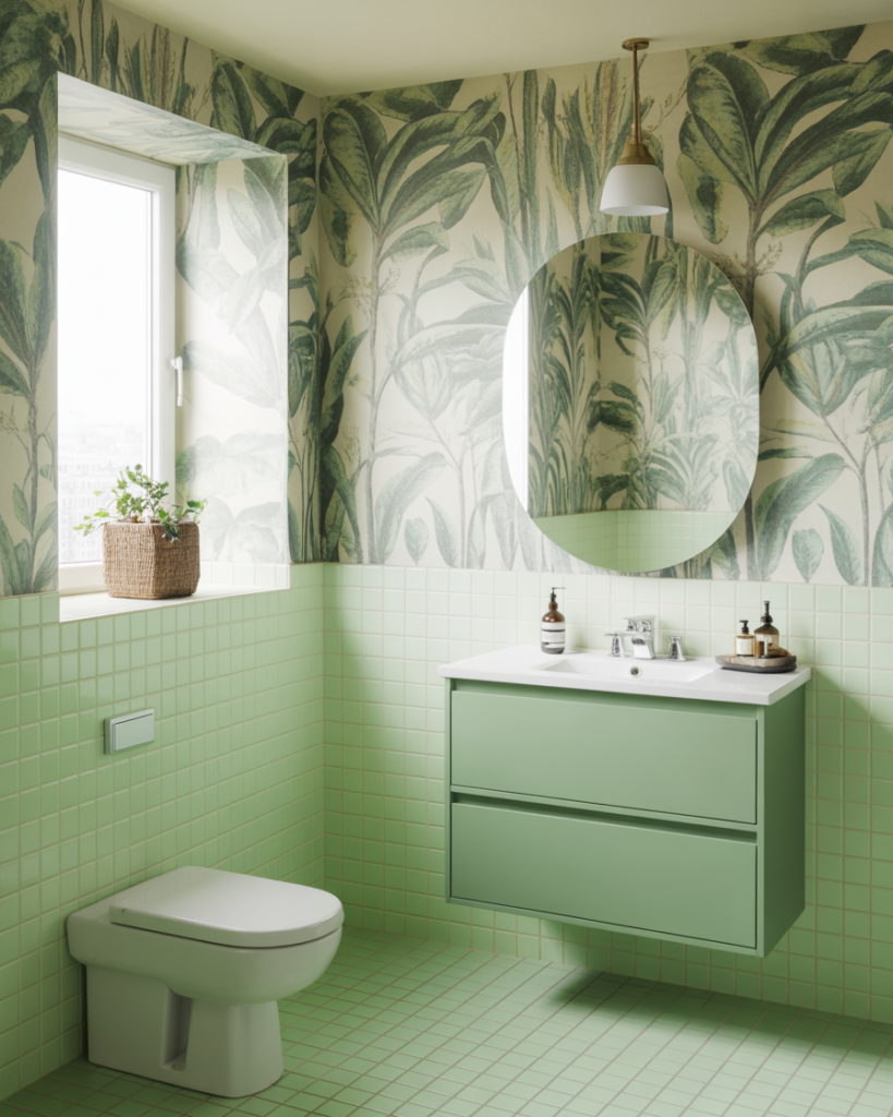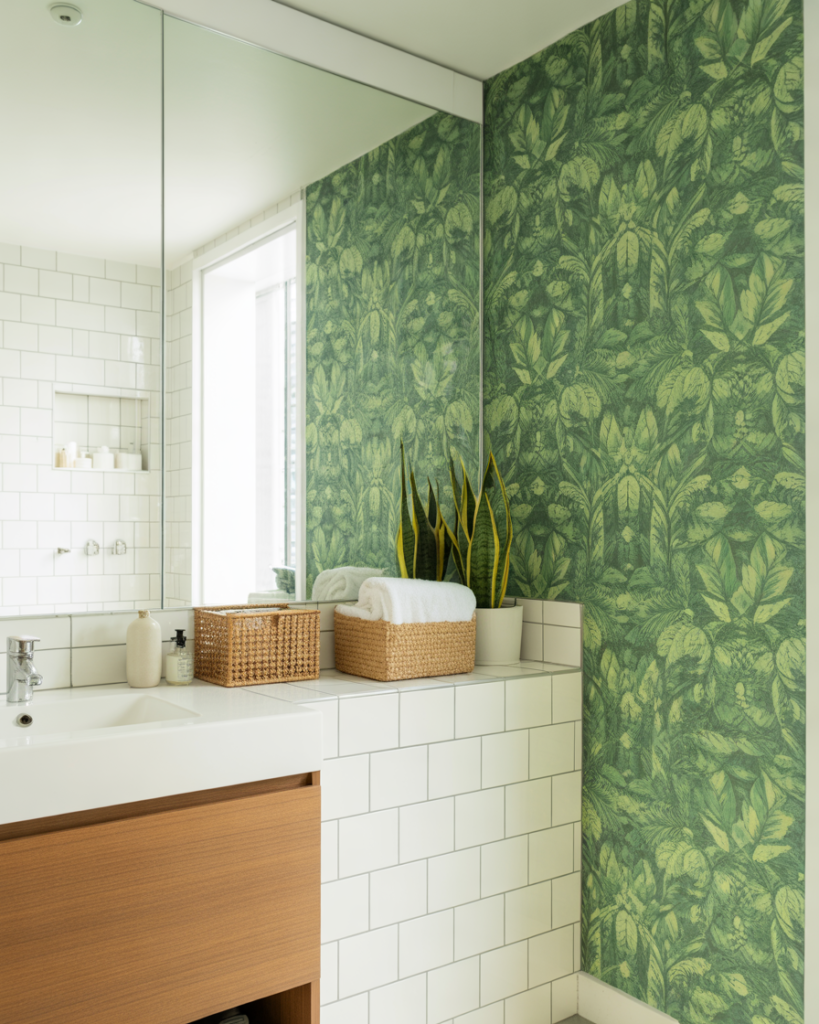 A bold green wallpaper can instantly elevate a bathroom, especially when paired with clean tiles and a streamlined vanity. I once helped install fern-pattern wallpaper in a tiny studio bath, and the homeowner said it made the space feel curated and personal. This idea works well for renters who want color without repainting walls, offering an aesthetic upgrade with minimal effort.