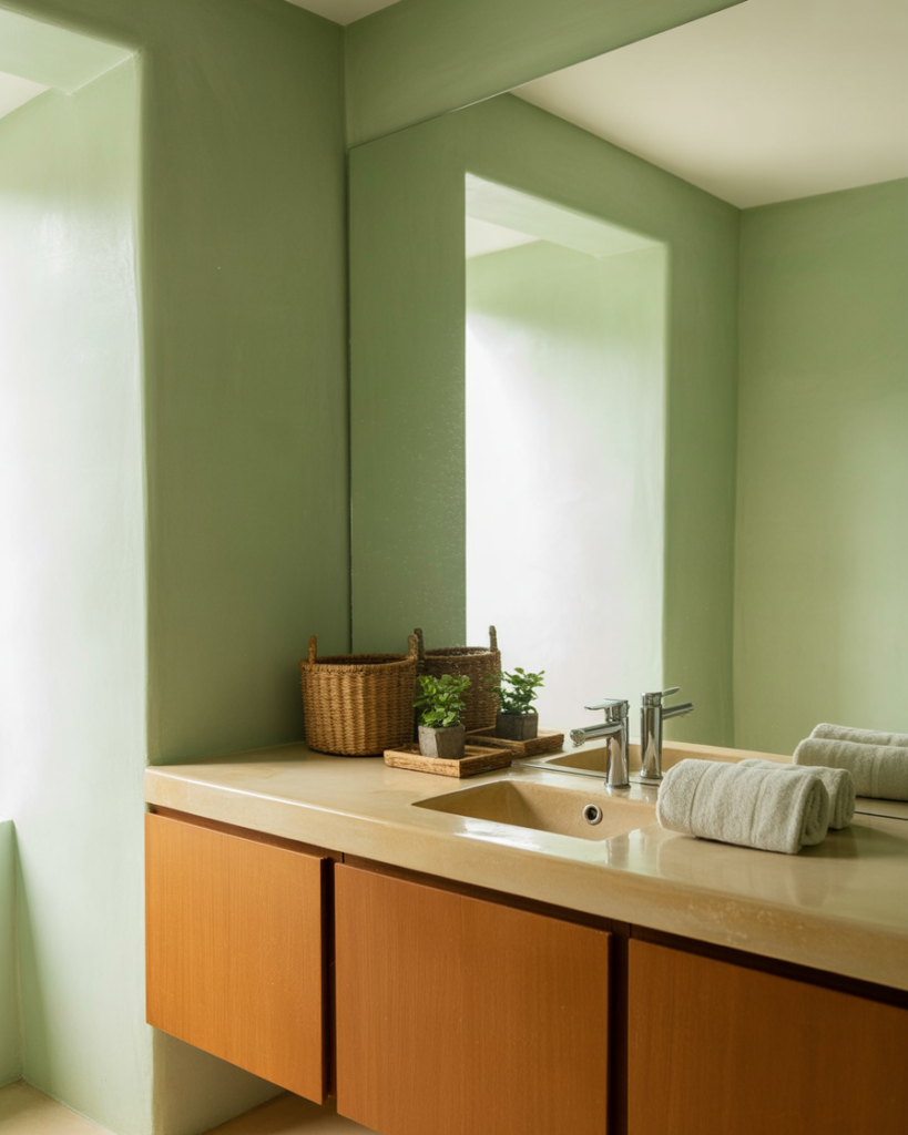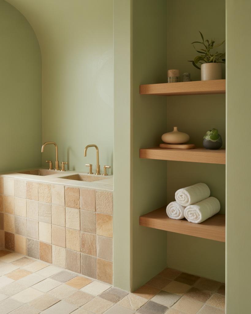 A Sage bathroom introduces a gentle, natural calm that feels timeless. Soft sage blends seamlessly with wood vanity bases and warm metals, making it ideal for renters or first-time homeowners who want subtle personality. A neighbor told me her tiny space looked brighter after switching to sage because of how the light reflects off the muted tone. This style suits airy, minimalist designs.