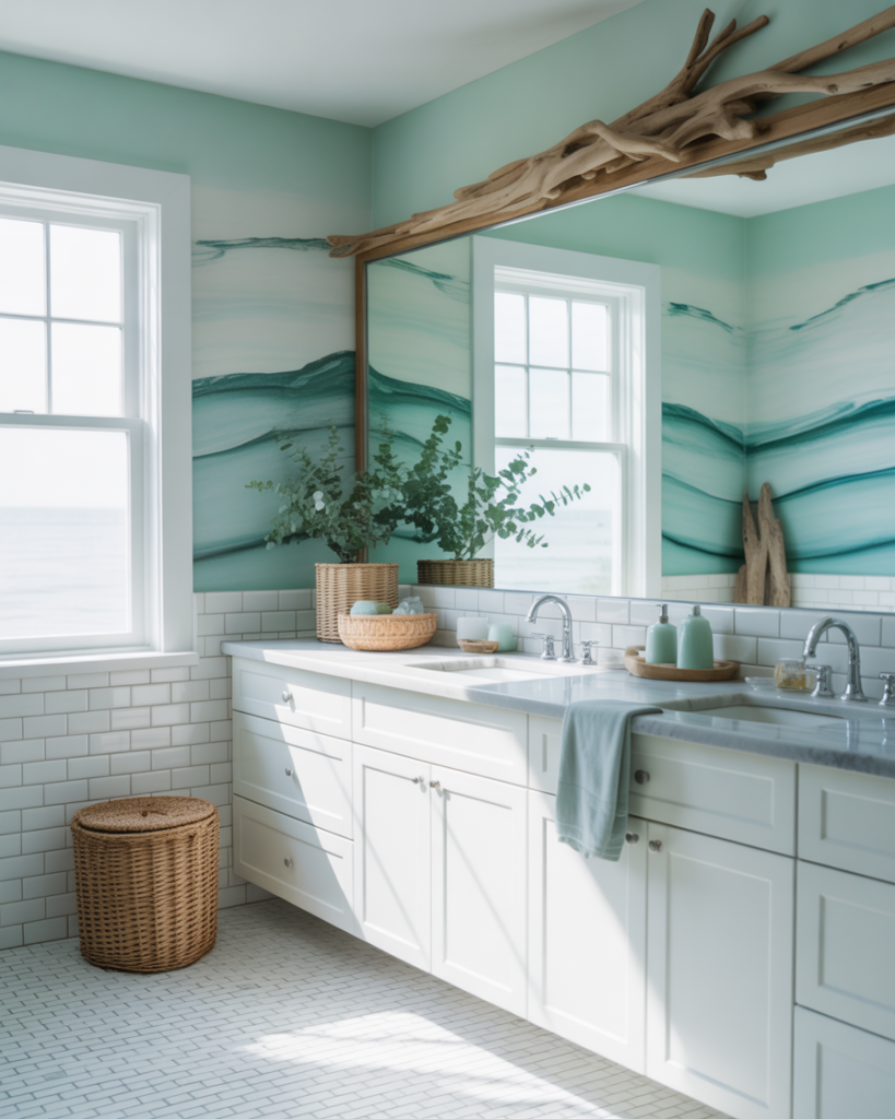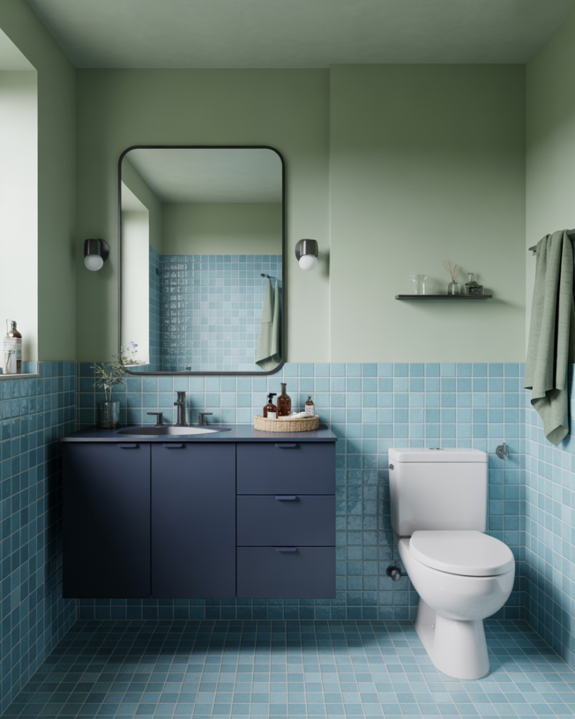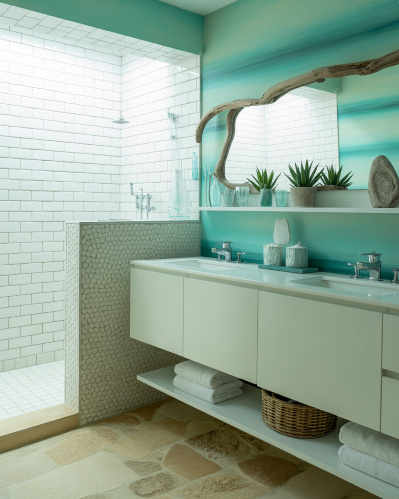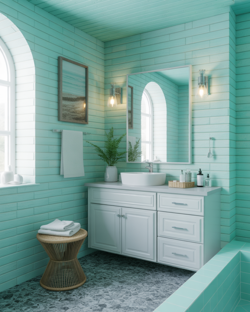 A Sea-inspired palette mixes teal, aqua, and pale green for a breezy spa feel. This look pairs beautifully with white vanity fronts, sandy stone flooring, and refreshing eucalyptus decor. My cousin used this style near the coast and said saltwater tones made her mornings feel energizing. It’s a great direction for relaxed, nature-driven designs.