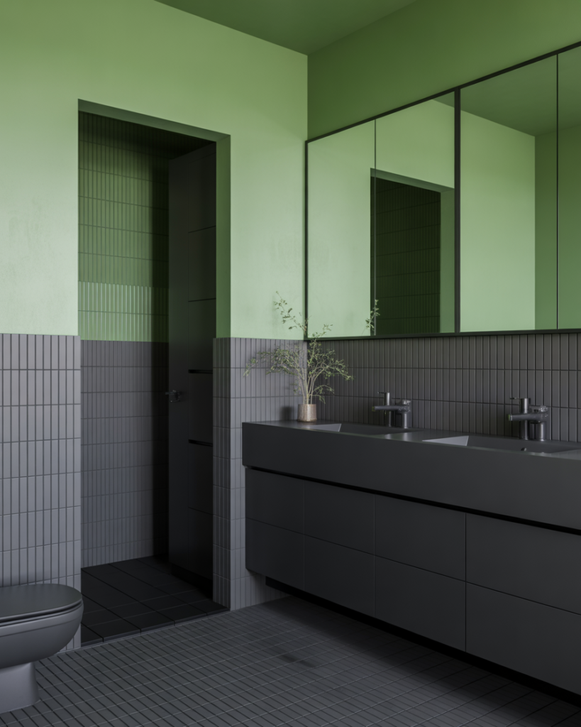 A Black and green bathroom offers a bold, graphic effect with high contrast. Matte black fixtures bring edge, while green paint or tiles soften the mood. A friend who loves Bauhaus styling said this pairing made her space feel architectural. This approach works well with geometric shapes, minimal clutter, and sleek cabinets that amplify the drama.