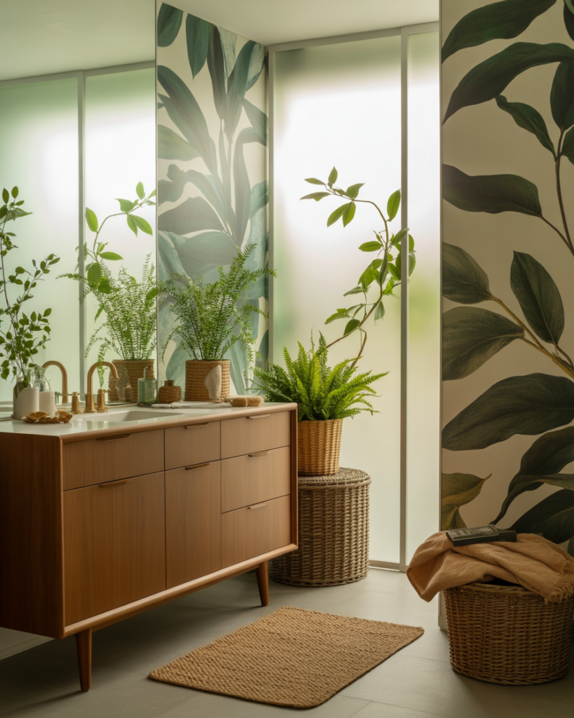 This Modern botanical style mixes leafy prints, plant-forward decor, and mid-century vanity shapes. I once saw a designer blend real and printed greenery, creating depth without overwhelming the space. It’s perfect for anyone who wants nature indoors but lacks time for constant upkeep. Organic textures add warm aesthetic layers to simple walls.