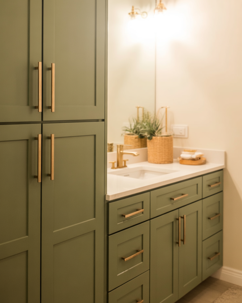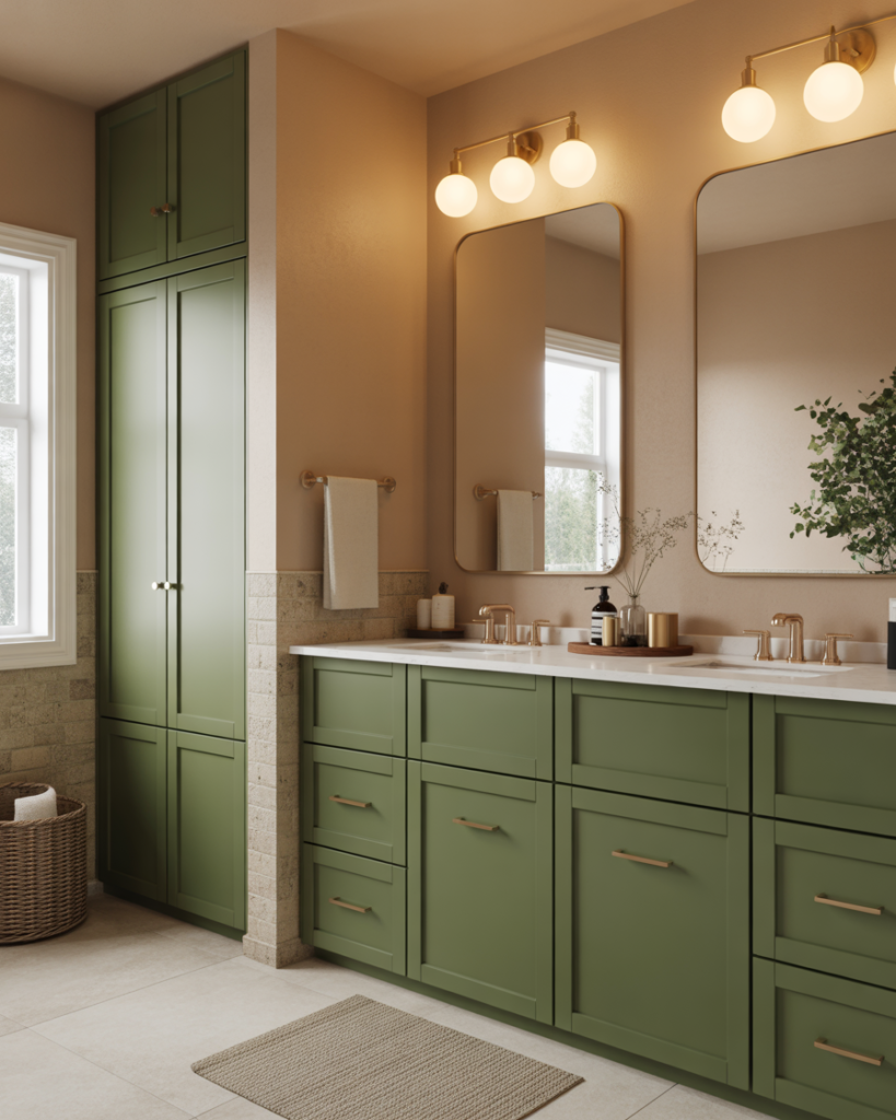 Green cabinets bring personality while keeping the rest of the bathroom neutral. I once updated an outdated bath with sage cabinetry, and it instantly felt custom-made. Pair with warm woods, brushed gold hardware, and soft light to add charm without overpowering the designs. This idea suits remodels aiming for subtle but confident color.