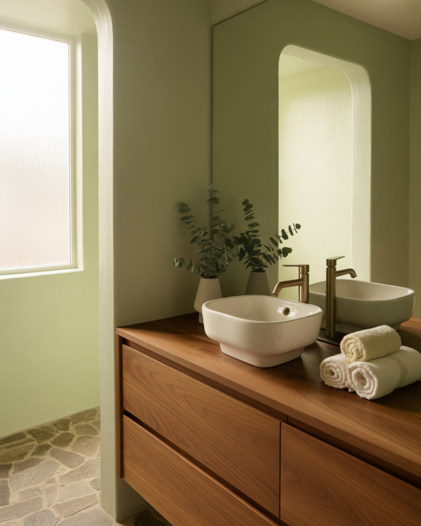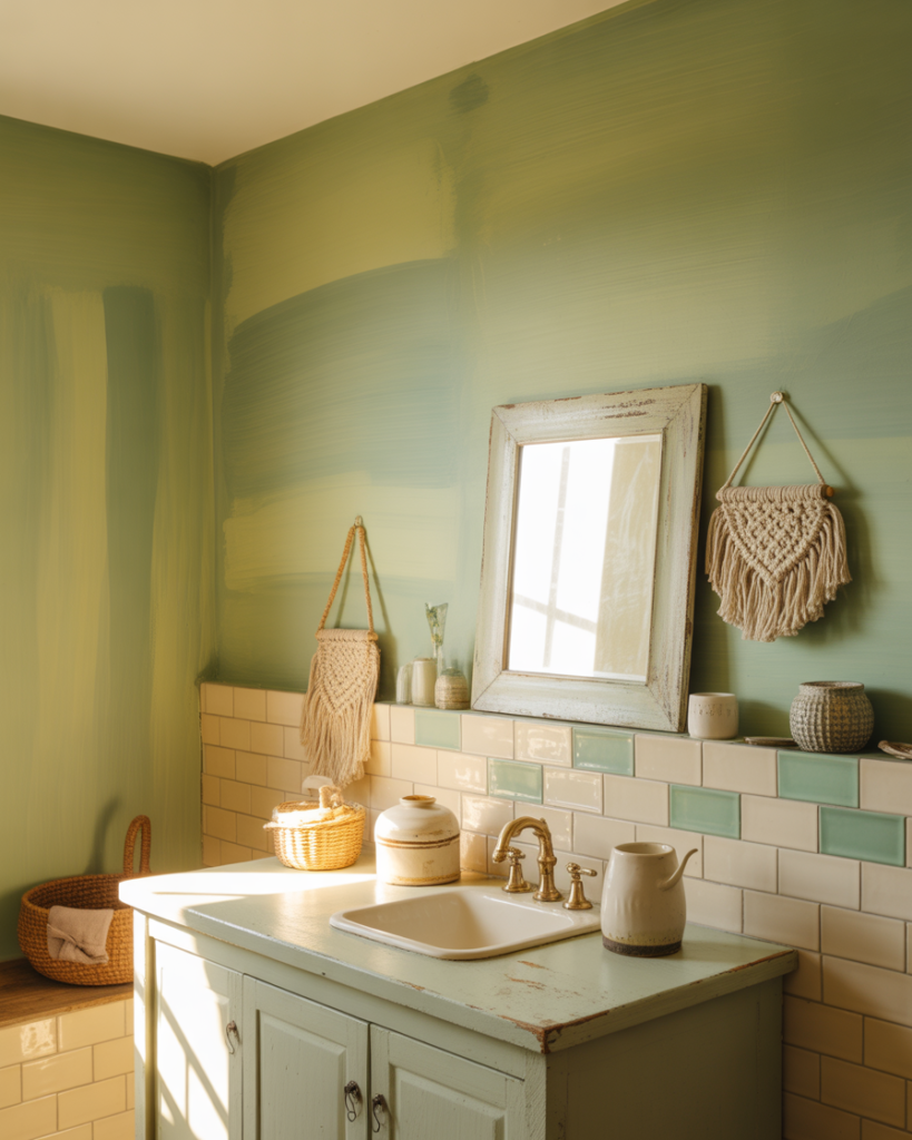 A soft green paint wash gives subtle texture and a handmade feel. When I tried this in a cottage bathroom, the slightly uneven finish added unexpected charm. This style blends beautifully with woven decor, artisan tiles, and small vanity spaces where character matters. It’s perfect for anyone seeking artisanal inspiration.