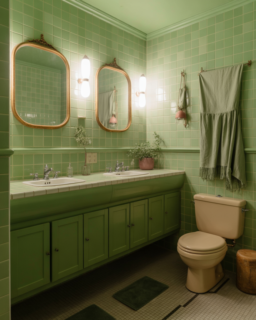 This vintage-forward aesthetic pairs muted greens with antique-inspired tiles, retro mirrors, and brass fixtures. I once saw this in a 1930s bungalow, and the green made the original details feel fresh instead of dated. Wood-trimmed cabinets and pastel touches tie everything together. Ideal for lovers of charm-filled decor ideas.