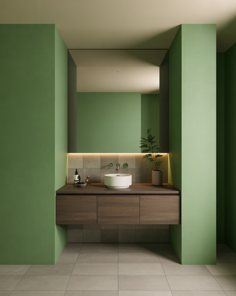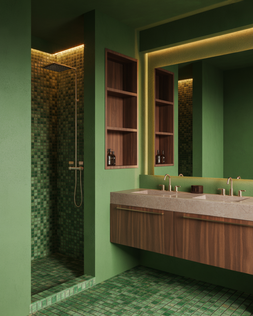 Going all-in with green walls can simplify a design while creating a unified feel. A designer friend said clients often overlook how calming a single-color envelope can be. Pair with floating vanity forms, neutral tiles, and pared-down decor to let the color speak. Best for modernists craving quiet boldness.