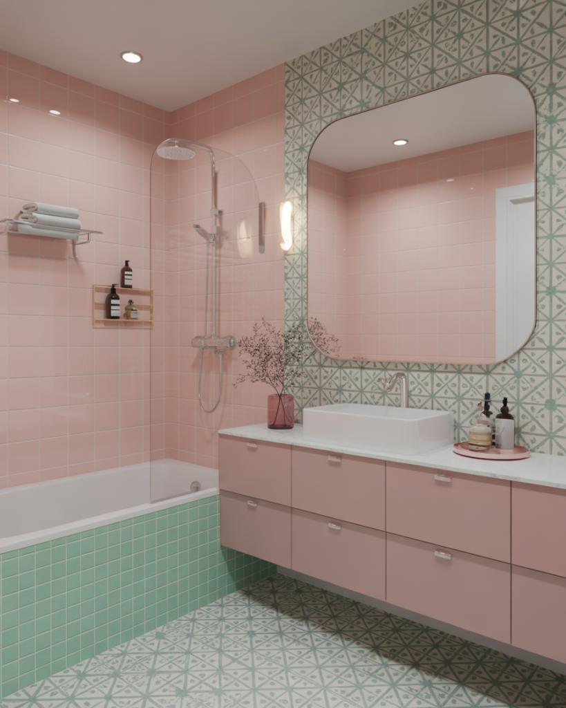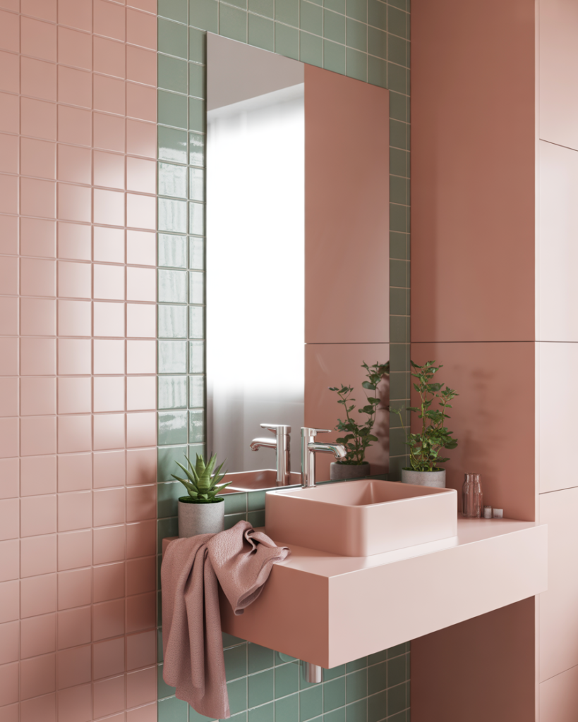 The blend of Pink and green brings cheerful contrast while staying elegant. Designers like Justina Blakeney often pair blush hues with earthy greens to create uplifting decor ideas that still feel grown-up. A friend told me her blush-and-green powder room always surprises guests—in a good way. This palette works well with patterned tiles and slim vanity designs for playful sophistication.