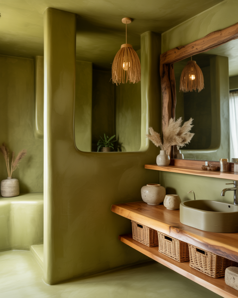 An Olive green scheme offers earthy comfort through warm undertones and soft textures. Olive is a favorite of nature-first blogs like The Spruce because it pairs beautifully with organic materials and handcrafted decor. I used olive in a past remodel, and it made my small bath feel grounded without darkening the room. It’s excellent for layered designs with rattan and clay pieces.