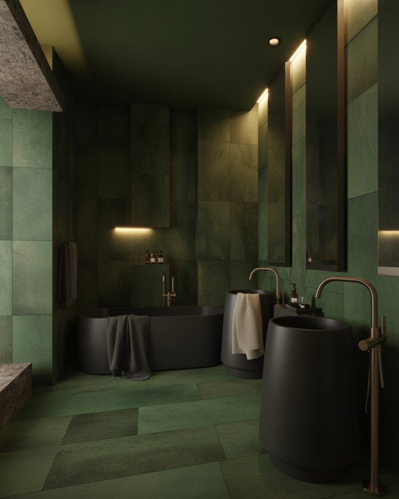 A Dark green retreat leans into moody calm with saturated decor, matte tiles, and softly glowing light that brings a spa-like feel. I once visited a friend who painted her walls deep green, and she said it instantly slowed her pace each morning. This style works beautifully in compact rooms, giving them dramatic depth while keeping the overall aesthetic modern and grounded.