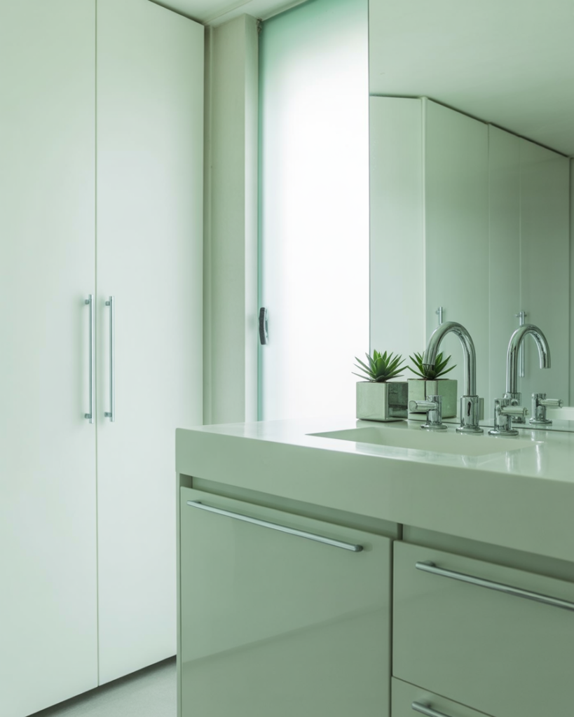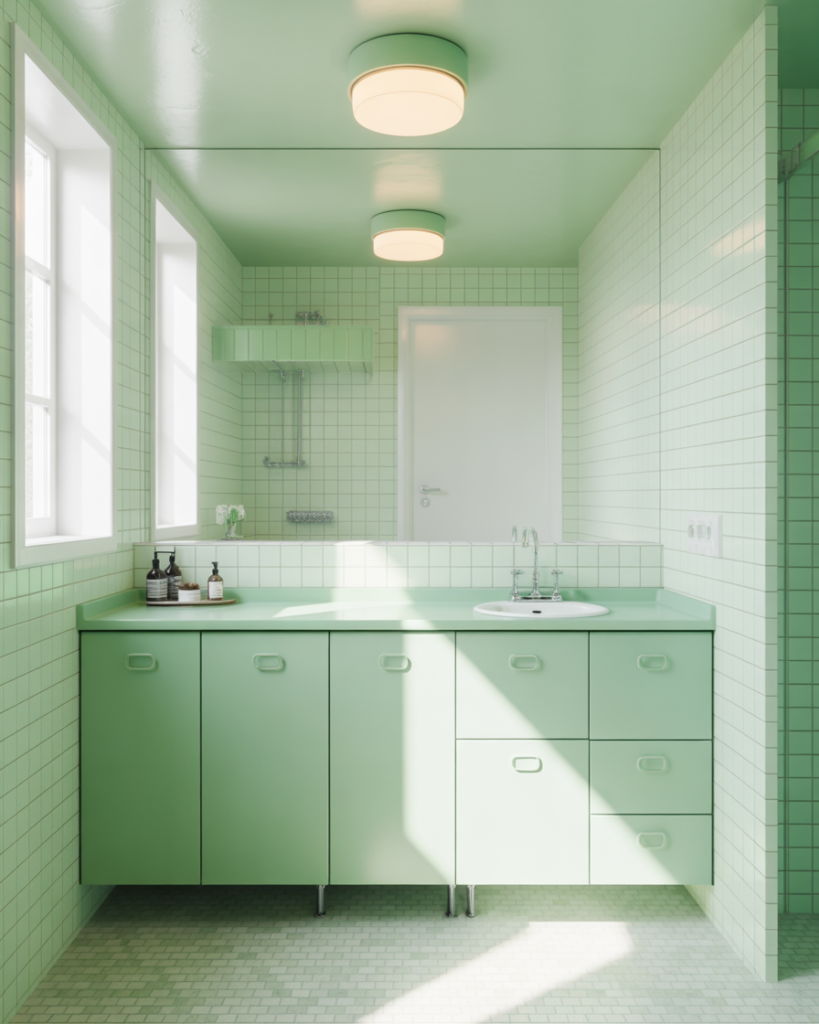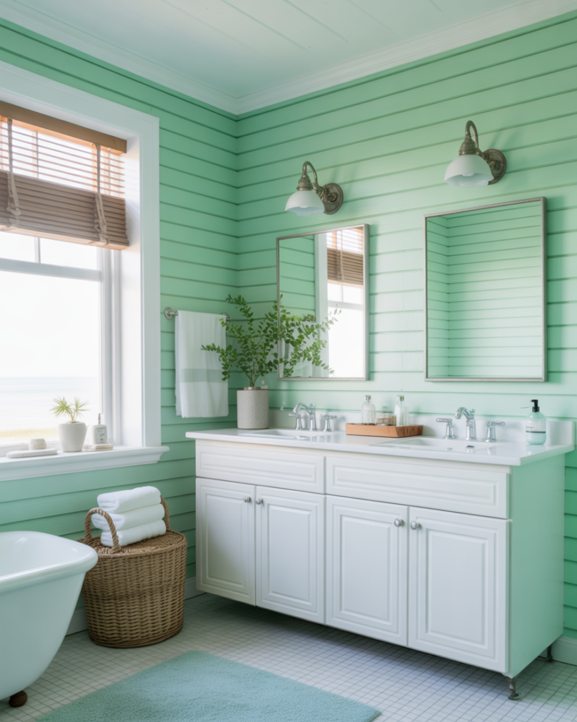 A Seafoam palette brings breezy freshness reminiscent of coastal mornings. Seafoam’s gentle coolness pairs wonderfully with white cabinets and natural fiber decor, giving even windowless rooms a light and airy feel. My aunt used seafoam in her lake house bathroom and said it instantly softened the space. This style suits relaxed designs with easy-to-clean surfaces.