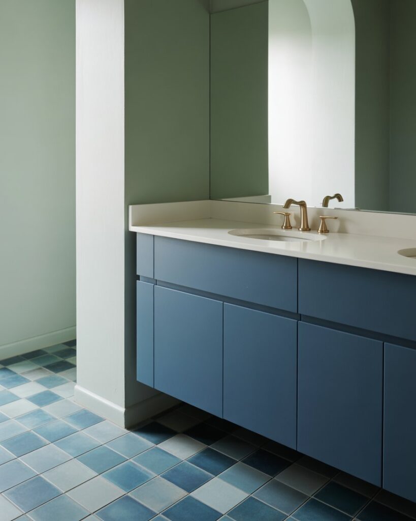 A Blue and green mix creates a refreshing, balanced palette blending water and foliage tones. Many designers praise it for its versatility in tiles, walls, and vanity finishes. I once paired navy cabinetry with muted green paint, and the result looked unexpectedly custom. This idea works for both modern remodels and classic homes seeking subtle color movement.