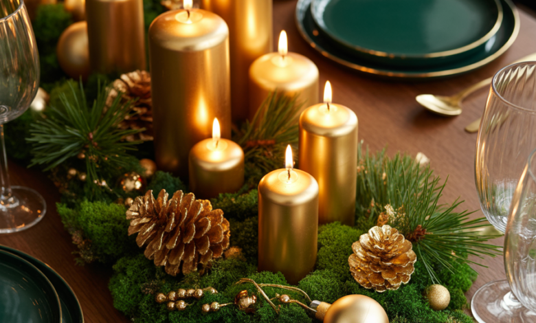 Nothing says holiday glamour like gold accents. Use gold cutlery, napkin rings, and a metallic centerpiece bowl filled with ornaments. This classy idea glows under candlelight, adding luxury without excess. Pair it with neutral tones for a balanced elegant finish.