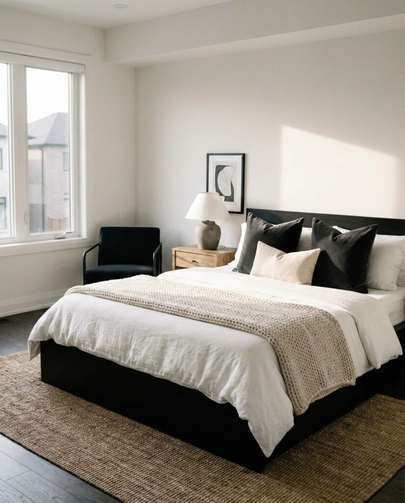 A Black and white bedroom remains timeless but now feels more Grown and intentional. This look appeals to Couples and Women who appreciate contrast without visual noise. Crisp white walls paired with black-framed furniture, lighting, or art create clarity and order. I’ve seen this palette succeed best when softened with textiles—think cotton bedding or woven rugs—to avoid harshness. It’s Simple, Elegant, and ideal for those who want structure with personality.