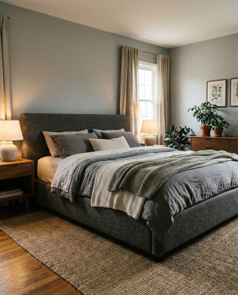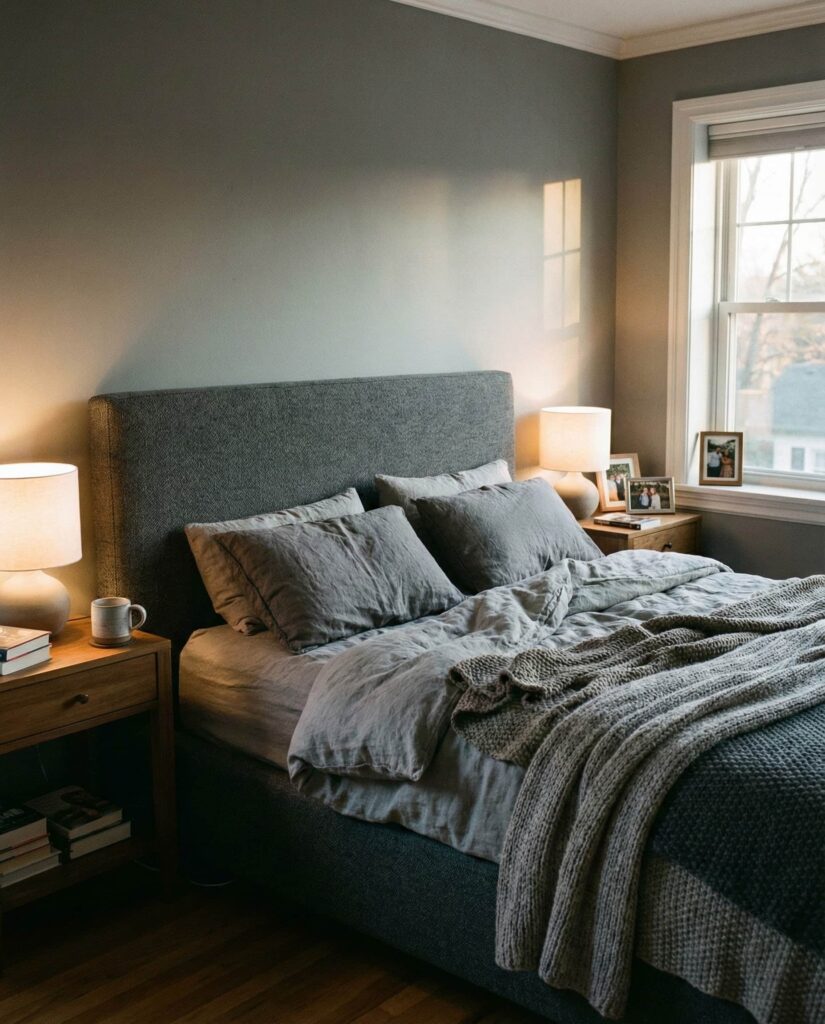 Grey continues to shine in bedrooms for couples cozy, offering neutrality without feeling cold. Layered Grey tones—from warm greige walls to deeper charcoal accents—create depth and calm. This style supports emotional comfort and works especially well with upholstered beds and soft lighting. I’ve found couples gravitate to grey because it feels fair and flexible for shared spaces. Add subtle wood or fabric textures to keep the room inviting rather than flat.