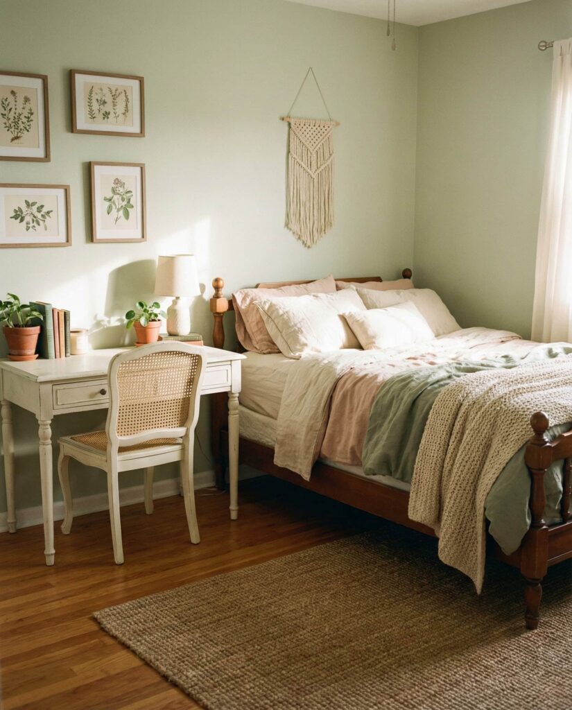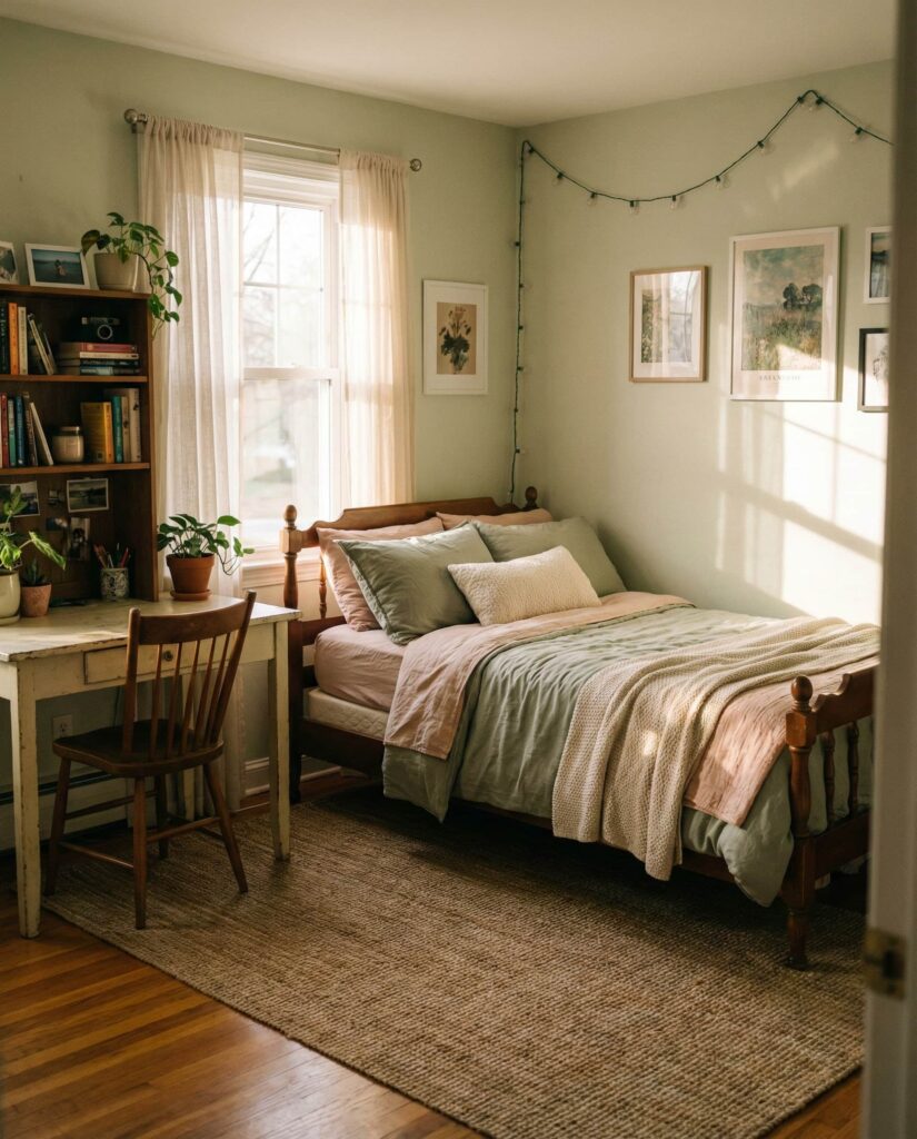 A Small room benefits immensely from thoughtful color, and muted Green has become a favorite for its calming effect. This idea works well for women apartment spaces and shared bedrooms alike. Soft sage walls, compact furniture, and vertical decor tricks make tight layouts feel breathable. I’ve helped friends repaint small bedrooms green and watched them instantly feel larger and more restful. Paired with natural light and simple decor, green creates balance without visual clutter.