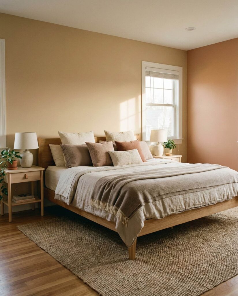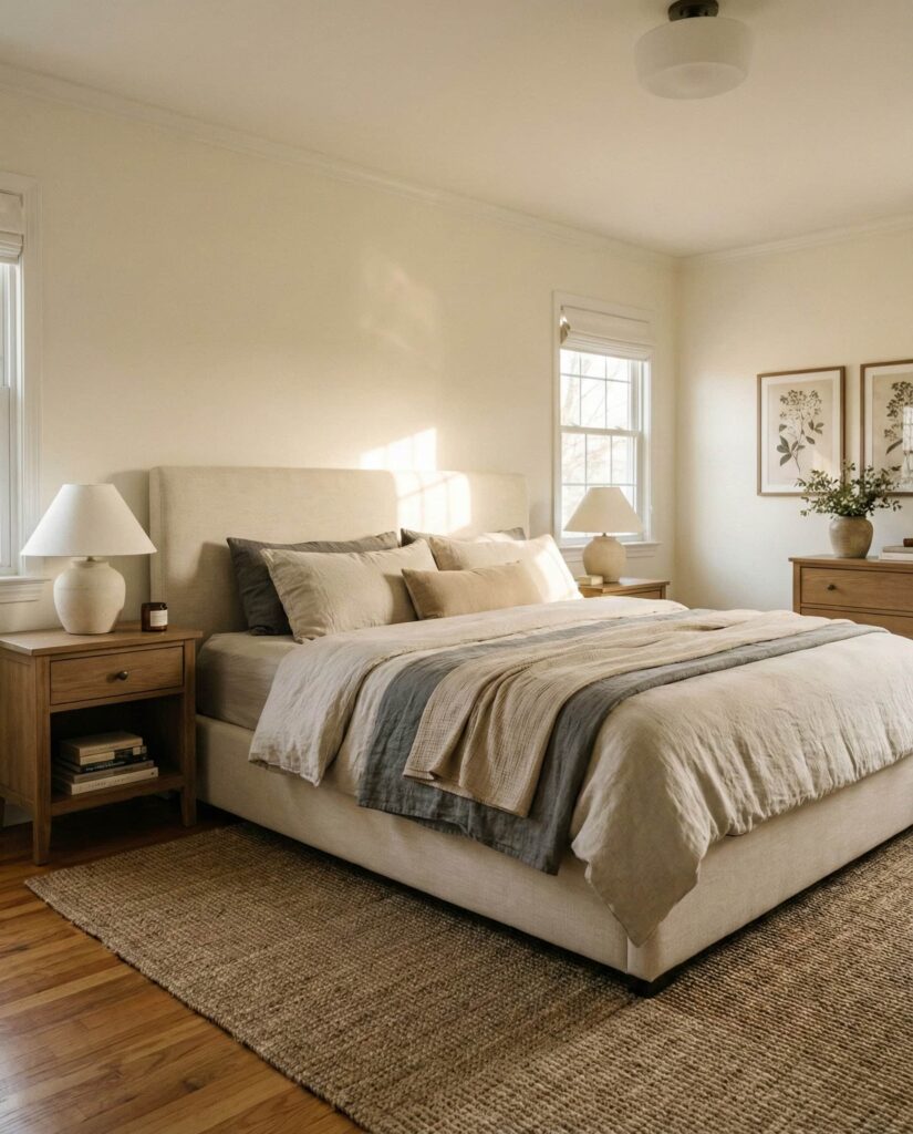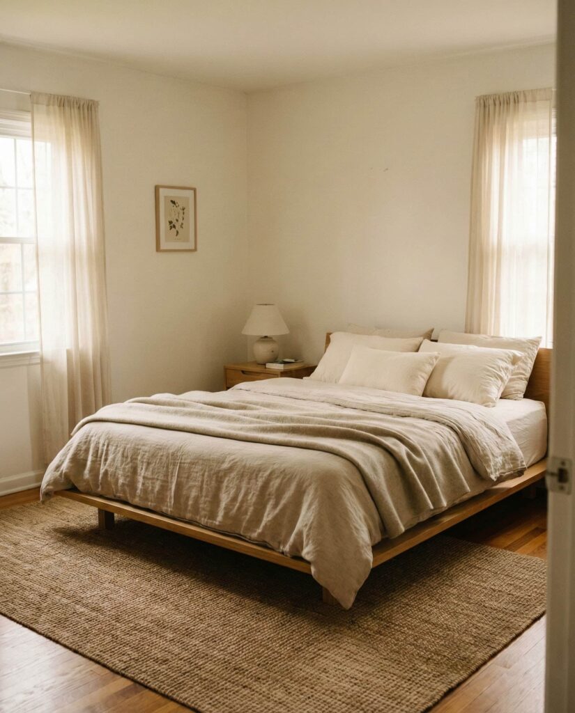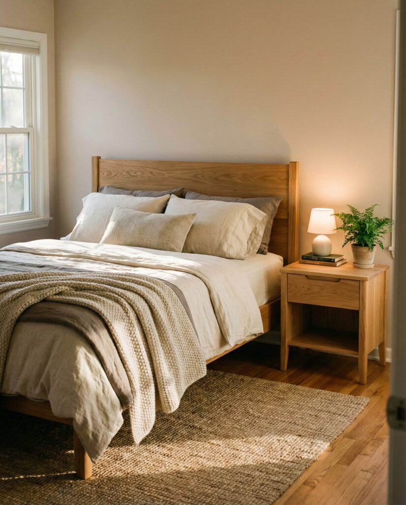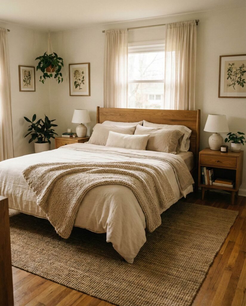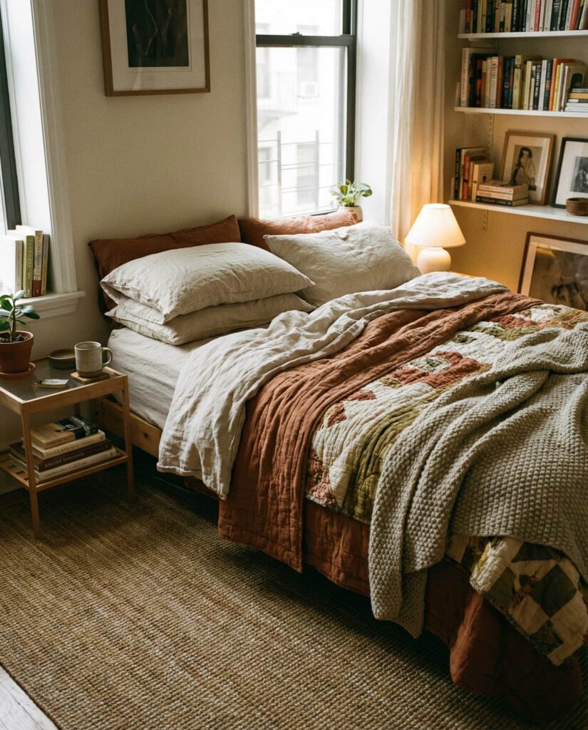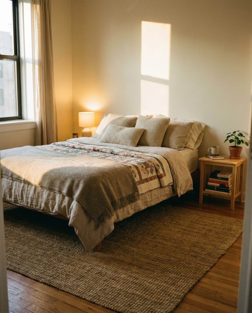 Apartment bedrooms benefit from layered comfort above all. Designed for women apartment living and urban Couples, this style uses rugs, throws, and lighting to create zones of comfort. I’ve noticed small apartments feel far more livable when the bedroom becomes a true retreat. Layering makes even a Small room feel intentional, warm, and deeply personal.