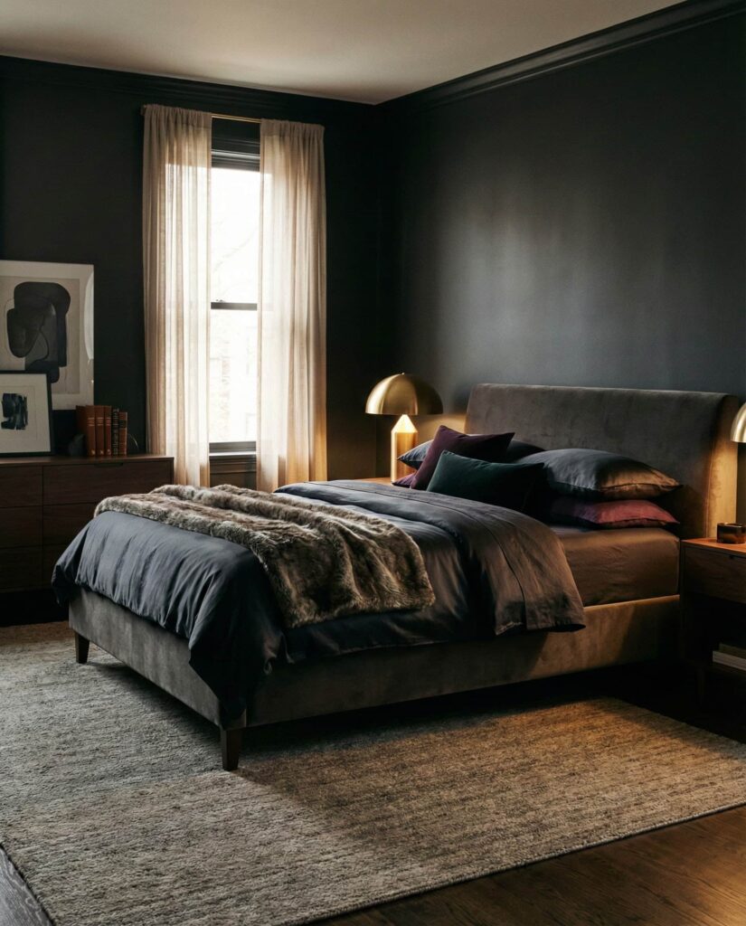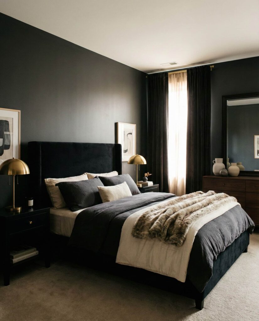 Dark bedrooms don’t have to feel heavy. By pairing Dark walls with lighter bedding or metallic accents, the space feels refined rather than moody. This look appeals for women luxe tastes and modern Couples alike. I’ve stayed in homes where dark bedrooms felt like sanctuaries—quiet, enveloping, and deeply restful. Balance keeps the style Chic and welcoming.