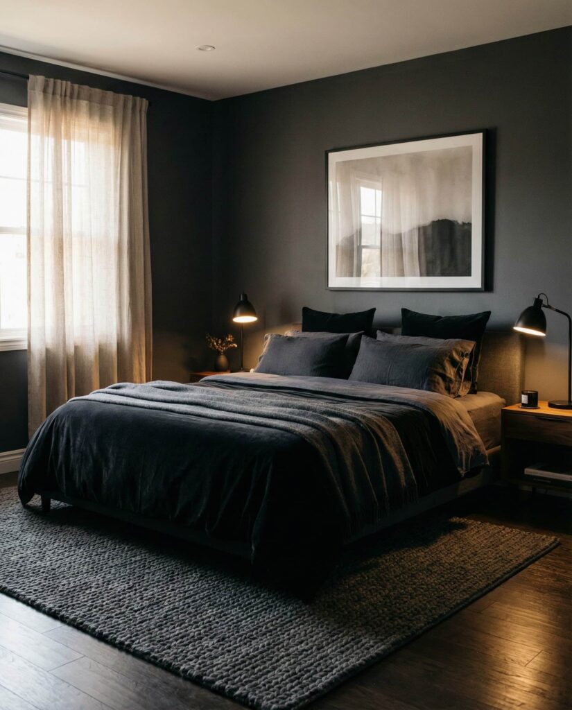 Dark bedrooms are having a sophisticated moment. Using Dark, Black, or even Black and white palettes creates intimacy and drama when done right. This style works well for women aesthetic tastes and confident Couples who want a hotel-like feel at home. Matte black fixtures, charcoal walls, and layered lighting prevent the space from feeling heavy. I’ve stayed in boutique hotels that use darkness to signal rest—and the same logic applies here. Balance is key: soft bedding and reflective surfaces keep the look Elegant, not oppressive.
