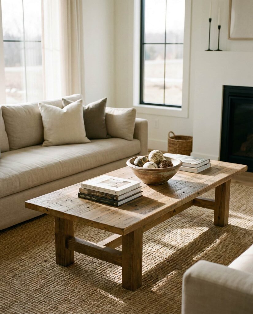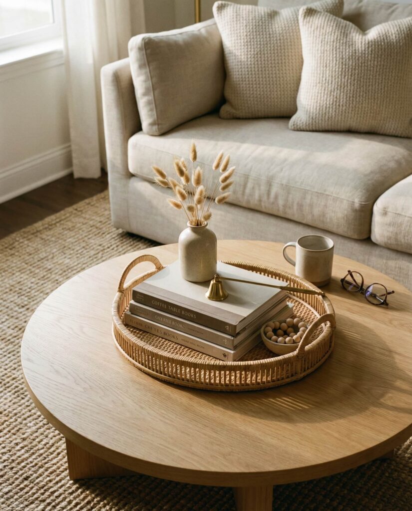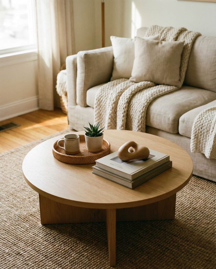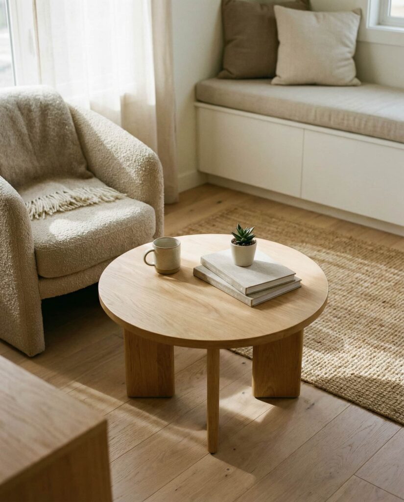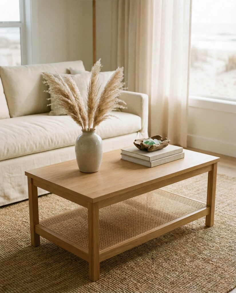 Coastal coffee table ideas aren’t limited to beach houses. In 2026, light woods, soft whites, and organic textures bring a relaxed coastal mood into everyday living room spaces. I’ve noticed this works especially well with Oval or Round tables that echo natural forms. Keep decor minimal—woven accents and neutral ceramics—to maintain the calm, breezy effect.