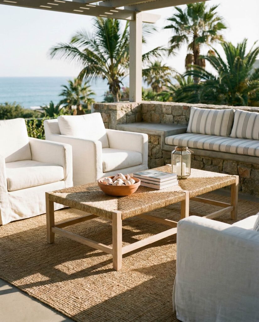 An Outdoor coffee table deserves just as much attention as indoor spaces. Coastal styling—light wood, woven textures, and relaxed forms—translates beautifully outdoors. Low tables with durable Wooden finishes work best, especially when paired with casual seating. These setups encourage slow mornings and long conversations, which feels very much in tune with how we live now.