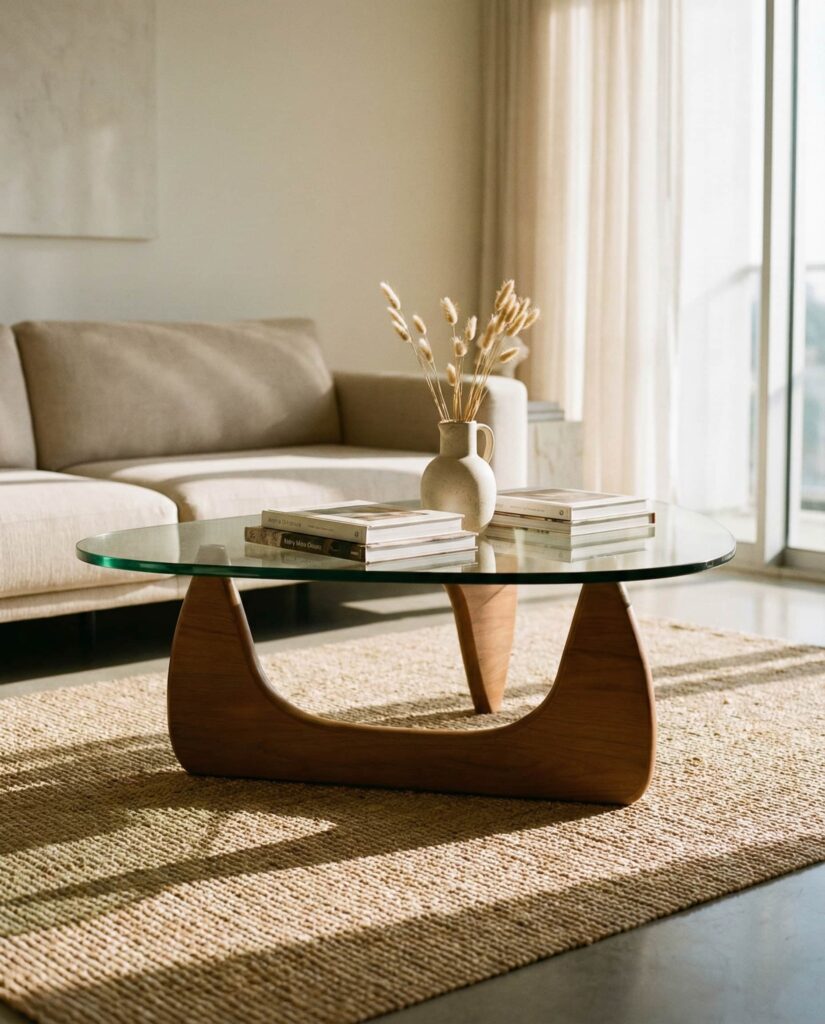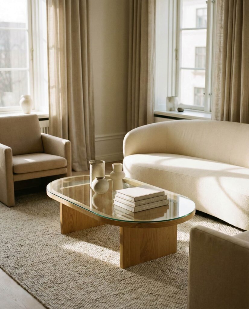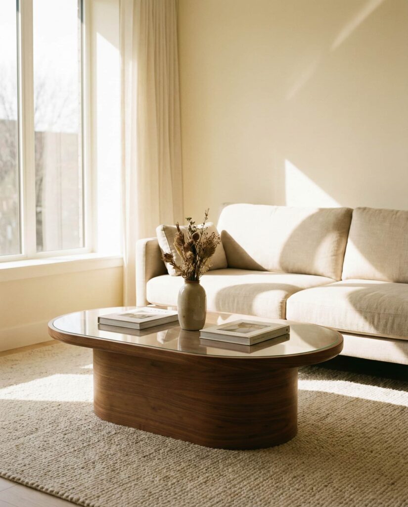 The Oval coffee table is having a quiet resurgence, especially in sleek Modern interiors. Its softened edges make it ideal for families and smaller spaces, while still feeling intentional. An Oval Glass or Wooden table pairs beautifully with curved sofas and organic textures. I’ve seen this shape work especially well in transitional homes where traditional meets contemporary. Keep styling light—books, a shallow bowl, and natural materials—to let the form speak for itself.