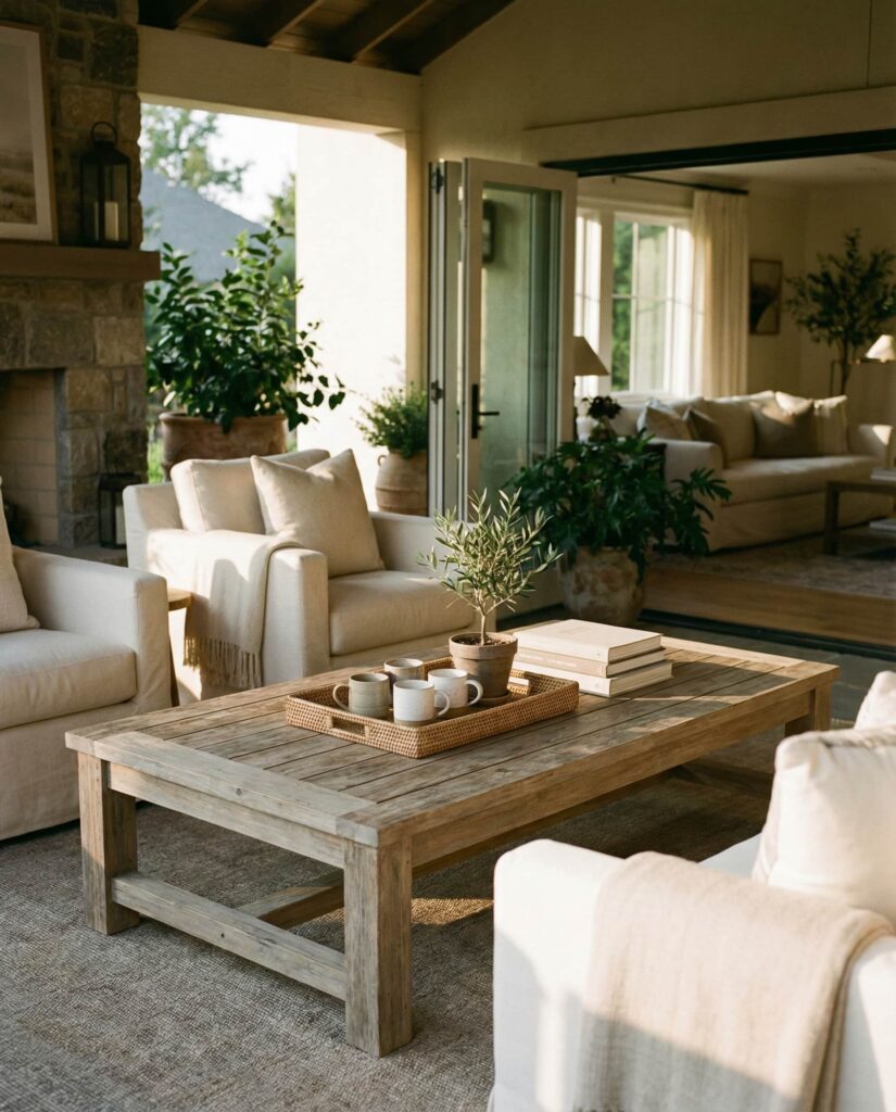 An Outdoor coffee table is no longer just seasonal. With durable materials and thoughtful styling, these tables become extensions of indoor living. I’ve styled outdoor tables with a Tray, books, and weather-safe ceramics to mirror interior comfort. This approach works beautifully on patios and covered porches, making outdoor spaces feel intentional and lived-in.