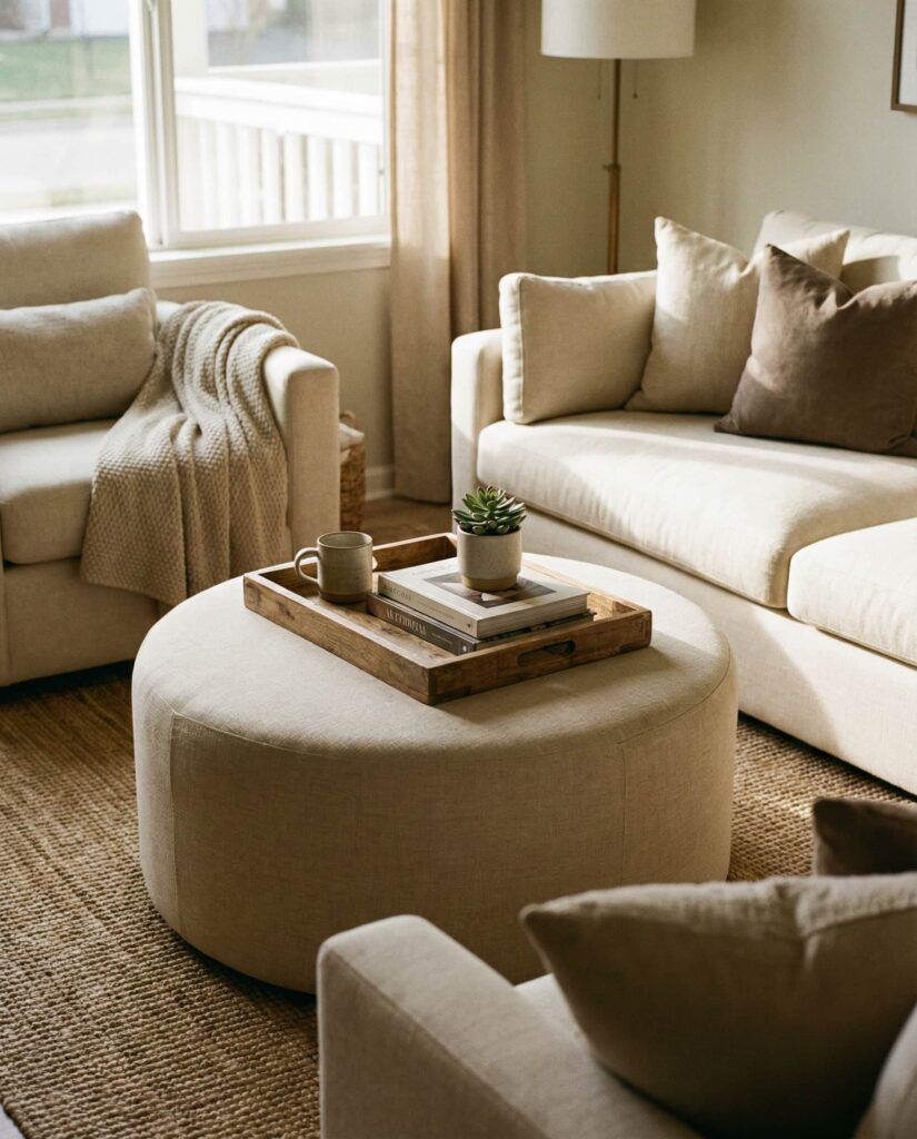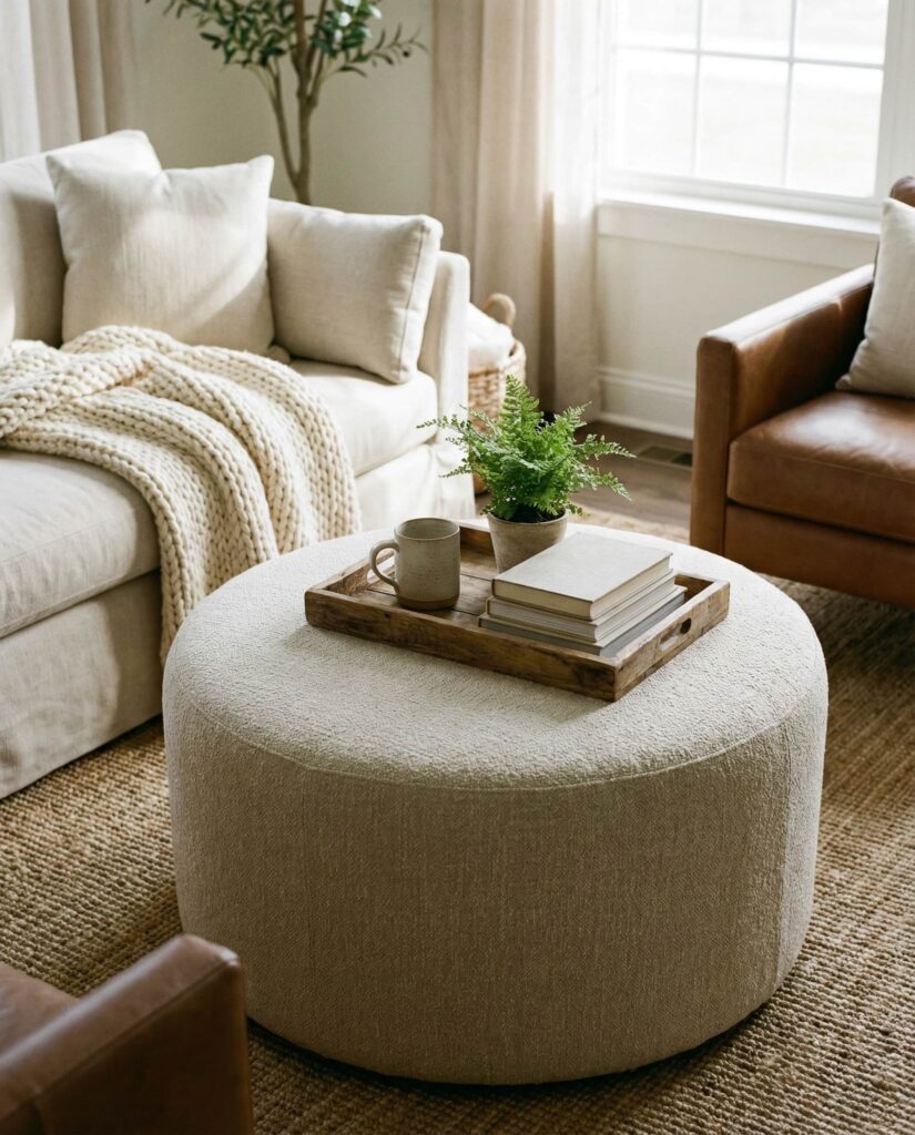 An Ottoman coffee table blends comfort and function, especially in relaxed living room environments. Upholstered surfaces invite feet-up evenings while still supporting trays for drinks or books. Designers often suggest pairing an ottoman with a sturdy Tray to maintain structure. In my experience, this option works well in family homes where flexibility matters more than formality. Choose neutral fabrics to keep the look timeless and adaptable.