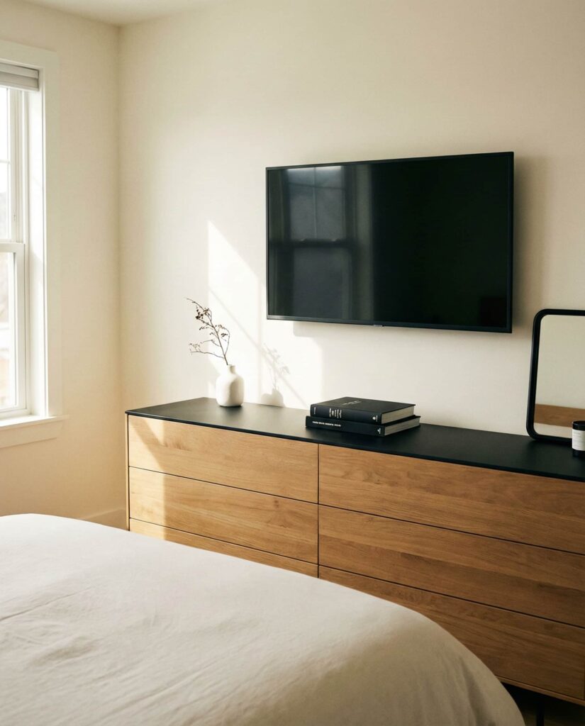 In a Bedroom with tv, the dresser plays a crucial role in maintaining visual calm. The Top of the dresser should support the Tv rather than compete with it. I’ve seen the best results when homeowners choose low-profile decor and repeat colors from the screen frame or wall. This is especially effective in a Bedroom with tv mounted, where symmetry and spacing matter. These Ideas focus on function first, using dresser decoration to soften technology’s presence and keep the room restful, not overstimulating.