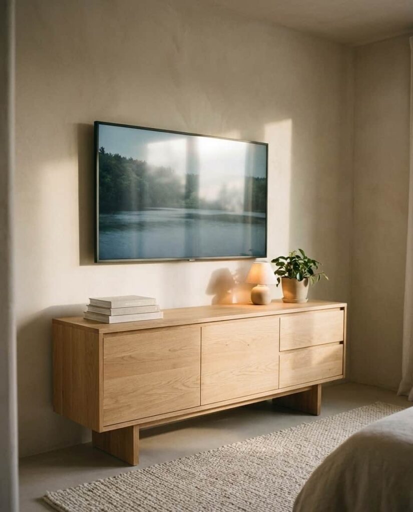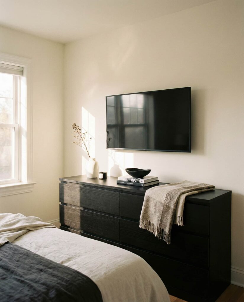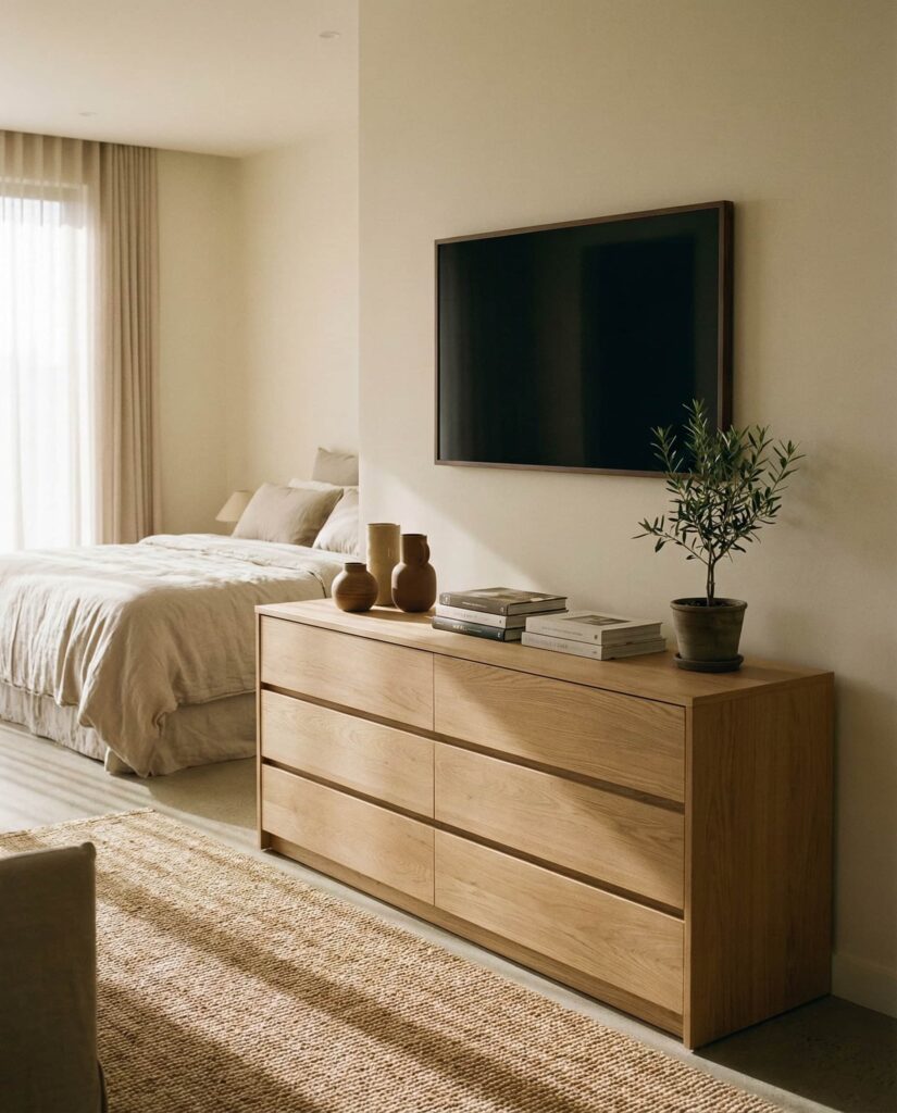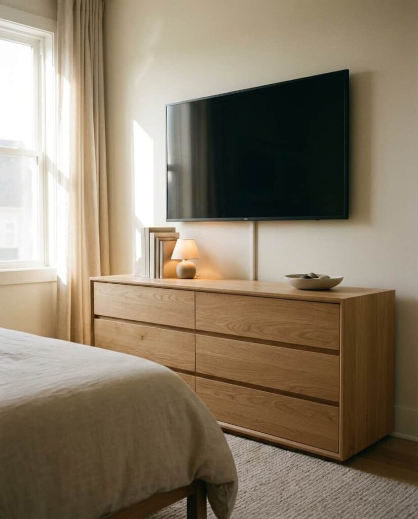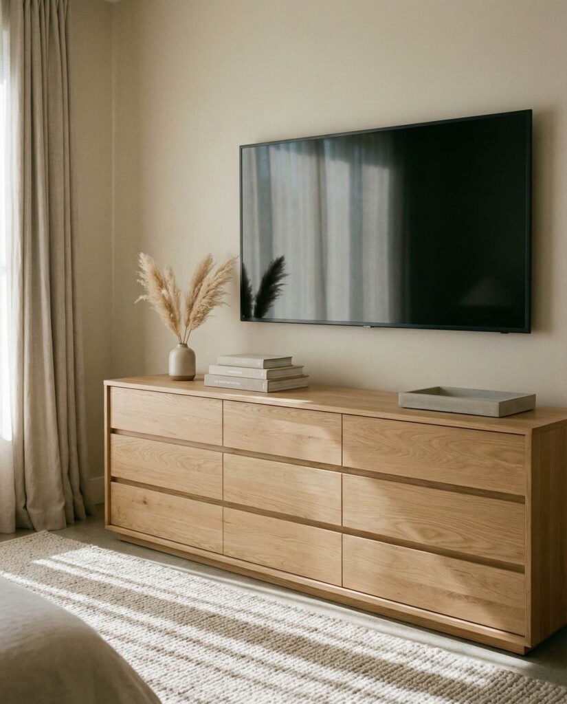 A Long dresser creates a sense of calm and proportion in a larger Bedroom, especially when the Top of it is styled horizontally rather than vertically. I often see designers recommending this setup for primary suites because it visually grounds the room. Low-profile decor such as trays, books, and short vases helps maintain flow and prevents clutter. This is also a smart solution for a Bedroom with tv mounted, where the dresser sits beneath the screen and needs to feel stable and intentional. Neutral finishes keep the focus on layout rather than objects. These dresser decoration ideas appeal to homeowners who want their space to feel expansive and relaxed, offering subtle but confident inspo.