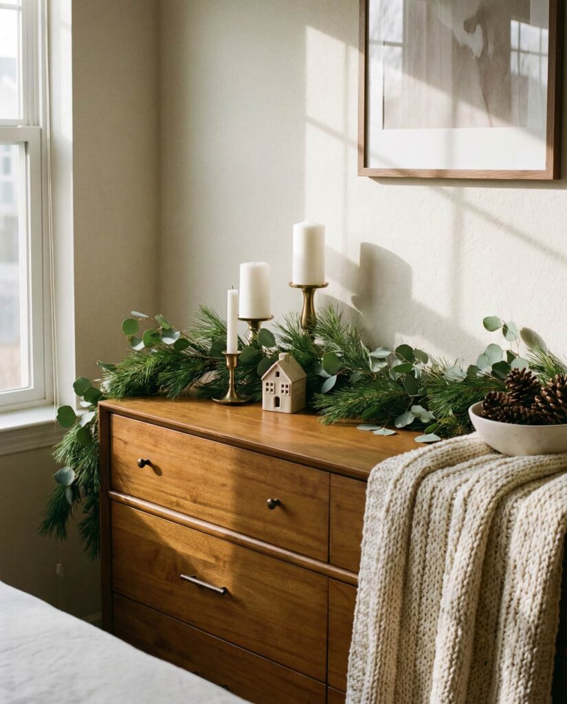 Seasonal Christmas decor on a dresser adds warmth without overwhelming a Bedroom. The Top of the dresser is ideal for subtle touches—greenery, candles, or small decorative objects—that nod to the season while preserving everyday function. I’ve found that restrained holiday styling feels more sophisticated and easier to live with. These dresser decoration ideas allow homeowners to celebrate without committing to major changes. The result is festive but calm, offering gentle inspo that enhances rather than disrupts the space.