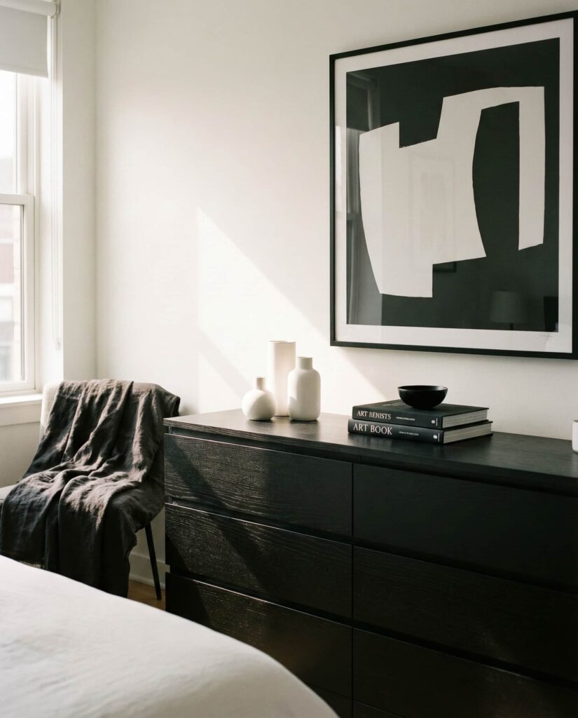 A Black and White color palette remains one of the most reliable Ideas for creating a polished Bedroom aesthetic, especially when styling the Top of a dresser. I’ve noticed that homeowners who prefer a Bedroom modern look often gravitate toward this contrast because it feels clean yet expressive. A black dresser topped with white ceramics, or the reverse, creates visual rhythm without overwhelming the space. This approach works equally well in a Bedroom with tv, where strong contrast helps balance technology with decor. Keeping the surface edited is key—one lamp, one sculptural object, and perhaps a framed print placed Above the dresser. These dresser decoration ideas feel intentional and timeless, offering long-term inspiration without chasing trends.