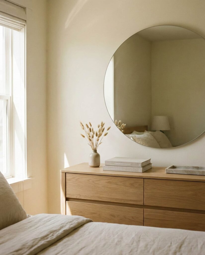 Placing a mirror Above the dresser is one of the most effective dresser decoration ideas for enhancing light and space in a Bedroom. In many aesthetic interiors, the mirror becomes the focal point while the Top of the dresser remains simple and grounded. I’ve observed that round or softly shaped mirrors work especially well in contemporary homes, adding contrast to linear furniture. This setup suits both ideas bedroom styling and shared spaces like a Living room dresser. The key is balance—letting the mirror do the visual work while decor stays minimal. It’s a practical choice that offers immediate inspiration without requiring constant updates.