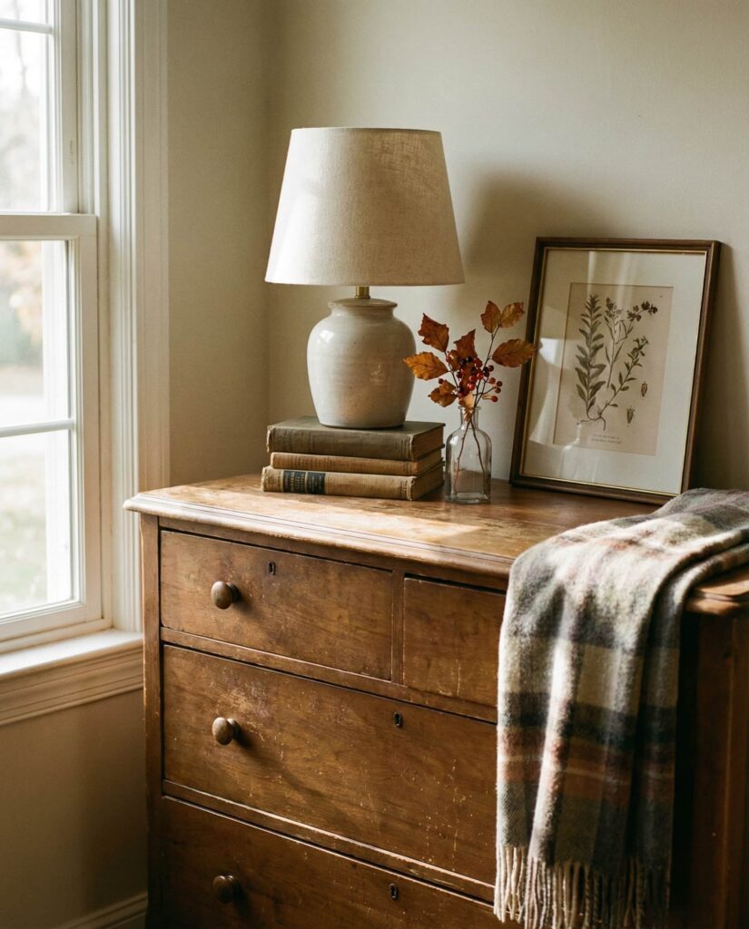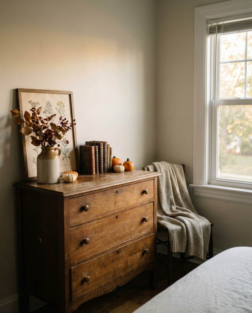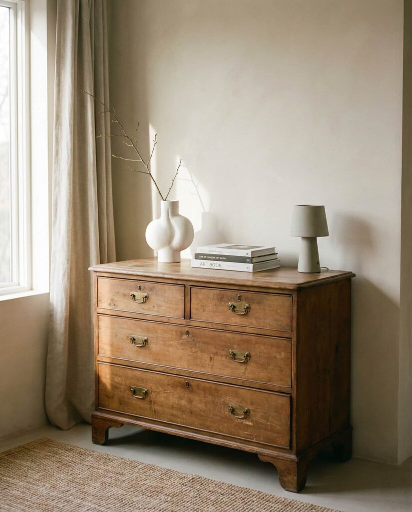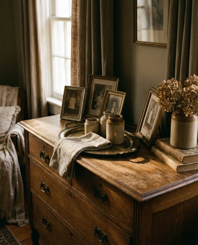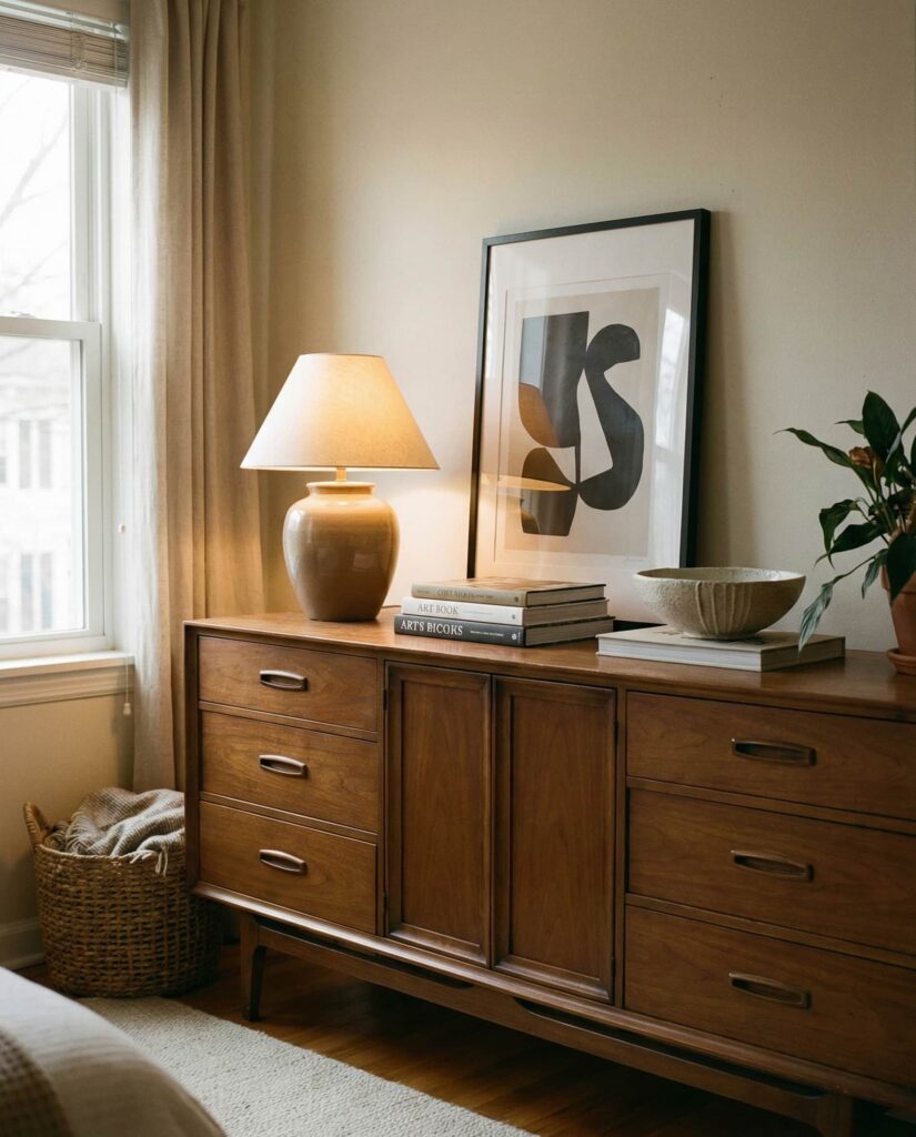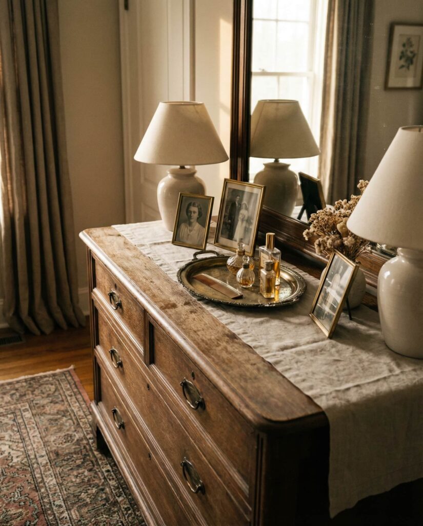 Rotating Vintage decor on the Top of a dresser is an easy way to refresh a Bedroom without redesigning it. I’ve noticed homeowners enjoy swapping objects seasonally—adding warmer tones in winter or lighter materials in summer. This approach works particularly well on solid wood dressers that already carry visual weight. These dresser decoration ideas keep spaces feeling dynamic while honoring existing pieces. It’s a sustainable, personal approach that offers ongoing inspo rooted in familiarity rather than constant consumption.