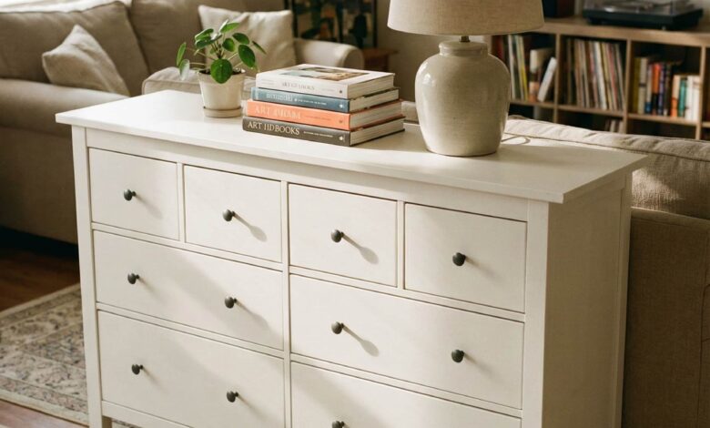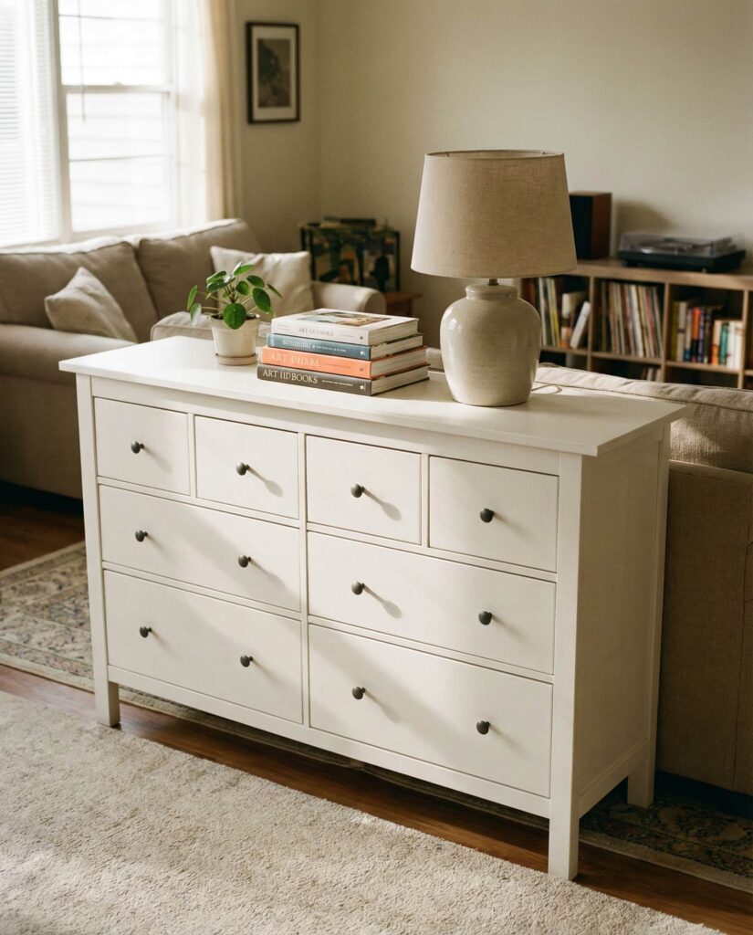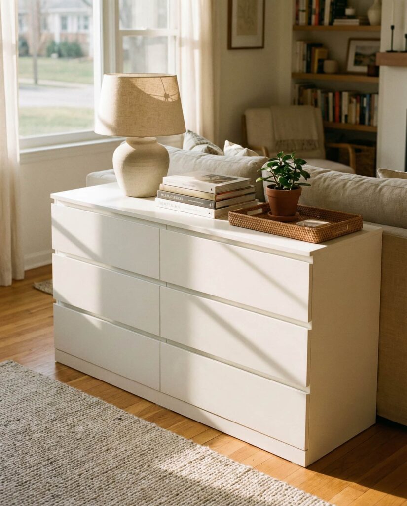 An Ikea dresser doesn’t have to stay in the Bedroom. I’ve seen many homeowners use them successfully in a Living room, where the Top of the dresser functions as a display surface. Styled with books, lamps, and art, it becomes a flexible storage piece that blends seamlessly into shared spaces. These Ideas highlight how accessible furniture supports creative dresser decoration ideas across the home, offering versatility and practical inspiration for modern living.