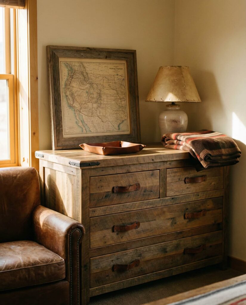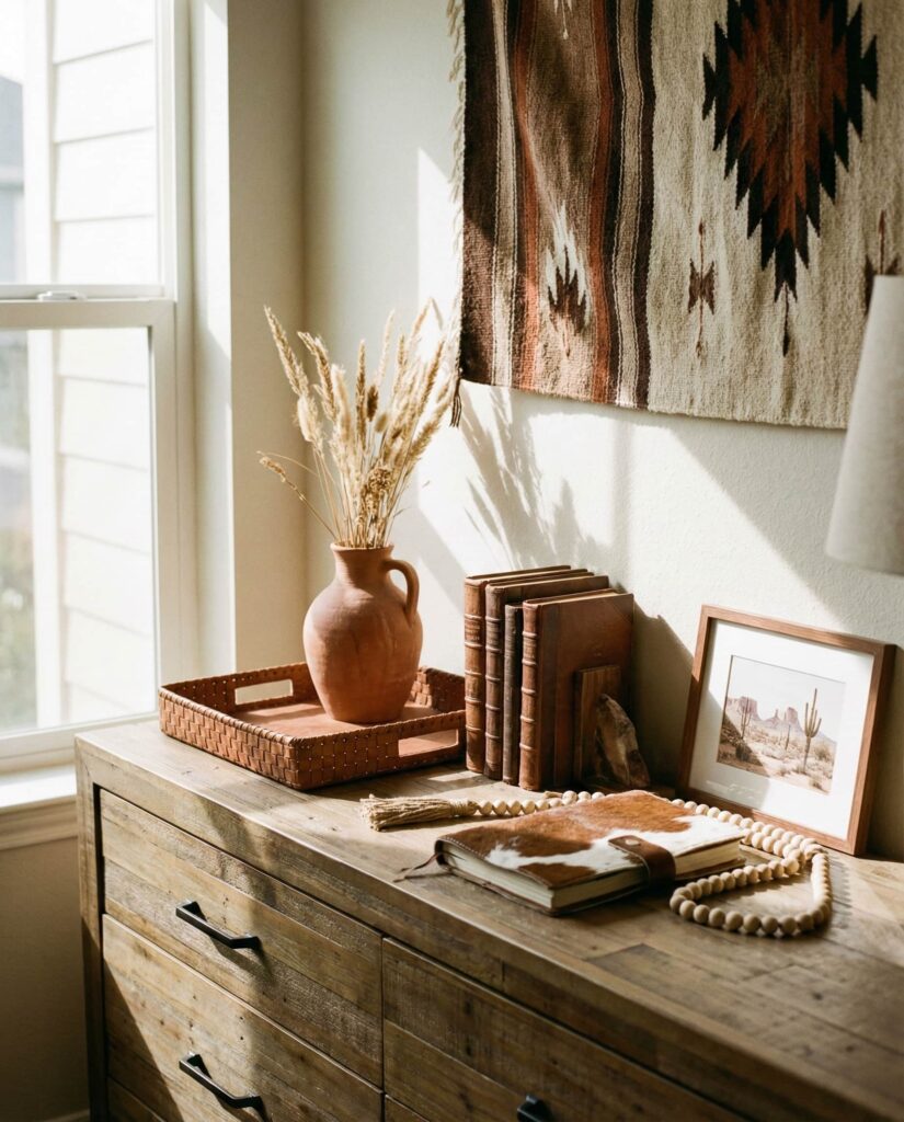 Western-inspired dresser decor brings character without feeling themed. In a grounded Bedroom, the Top of the dresser might feature leather accents, rustic wood frames, or understated metal details. I’ve noticed this style appeals to homeowners who want warmth with a bit of edge, especially in homes that blend modern and traditional elements. Earth tones and tactile materials keep the look authentic. These dresser decoration ideas feel confident and rooted, offering strong visual identity while remaining approachable and functional.
