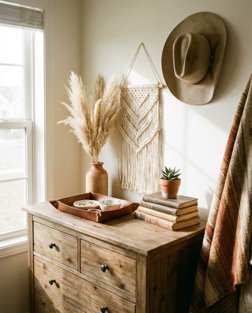 Combining Boho and Western elements on a dresser creates a layered, soulful look that feels grounded and expressive. On the Top of the dresser, natural textures, leather accents, and handmade objects work together effortlessly. I’ve noticed this hybrid style appeals to those who want warmth without clutter. It fits naturally into both Bedroom aesthetic and open-plan homes, offering rich texture and authentic inspiration without feeling overly styled.