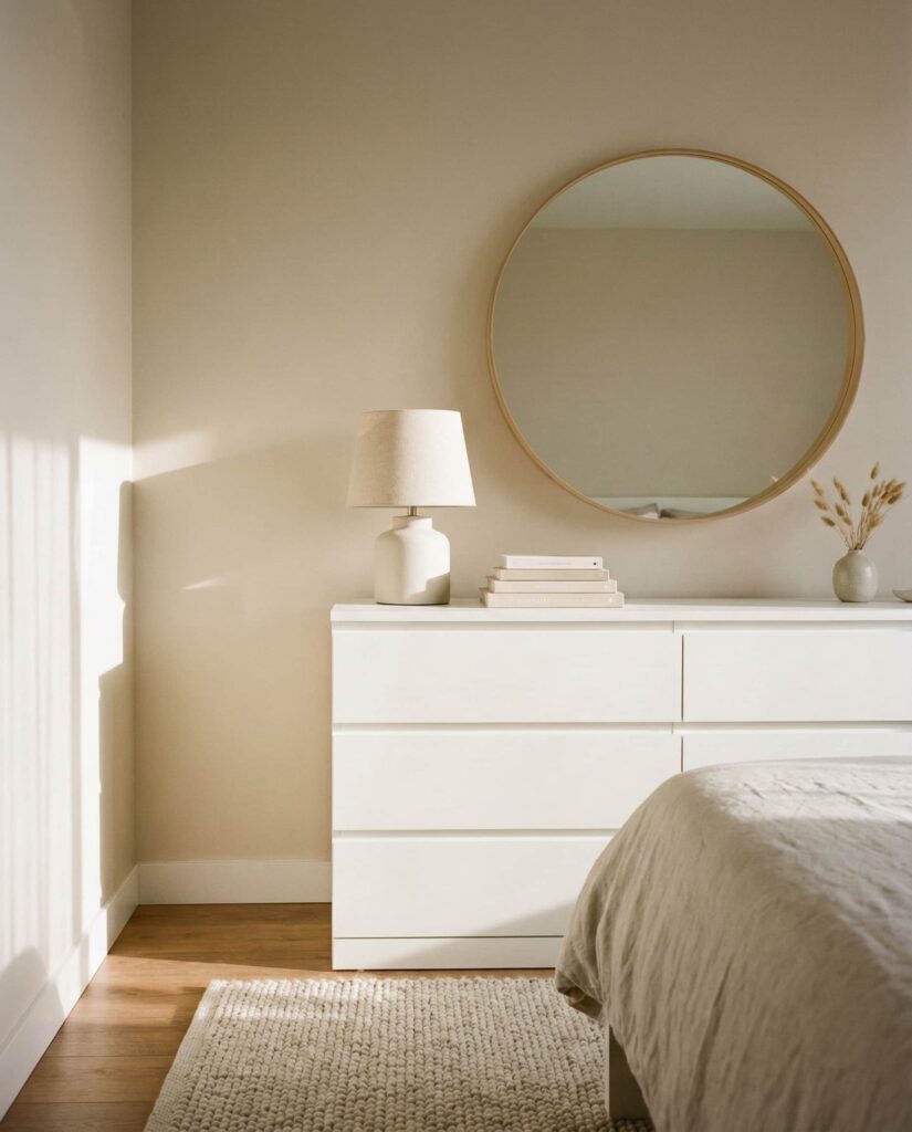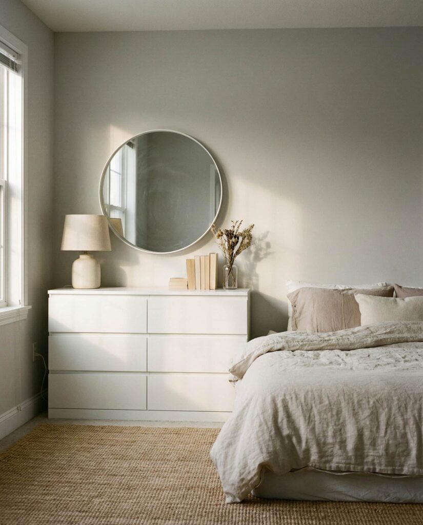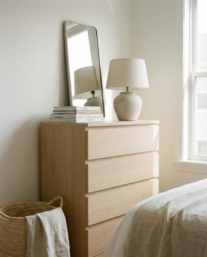 The Malm dresser from Ikea remains a staple because it adapts easily to changing styles. In many Bedroom aesthetic spaces, the Top of a Malm dresser is styled simply to let its clean lines shine. A round mirror, a small lamp, and one decorative object often feel like enough. I’ve seen renters especially embrace this look because it’s flexible and budget-friendly without feeling temporary. Choosing soft textiles or ceramics prevents the surface from feeling too stark. These Ideas work well in both minimalist and transitional homes, proving that approachable furniture can still feel elevated. Thoughtful dresser decoration here isn’t about excess, but about clarity and calm, which is exactly why this setup remains popular year after year.
