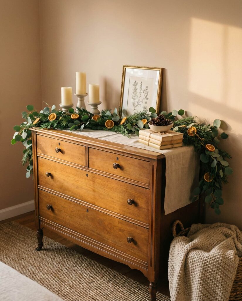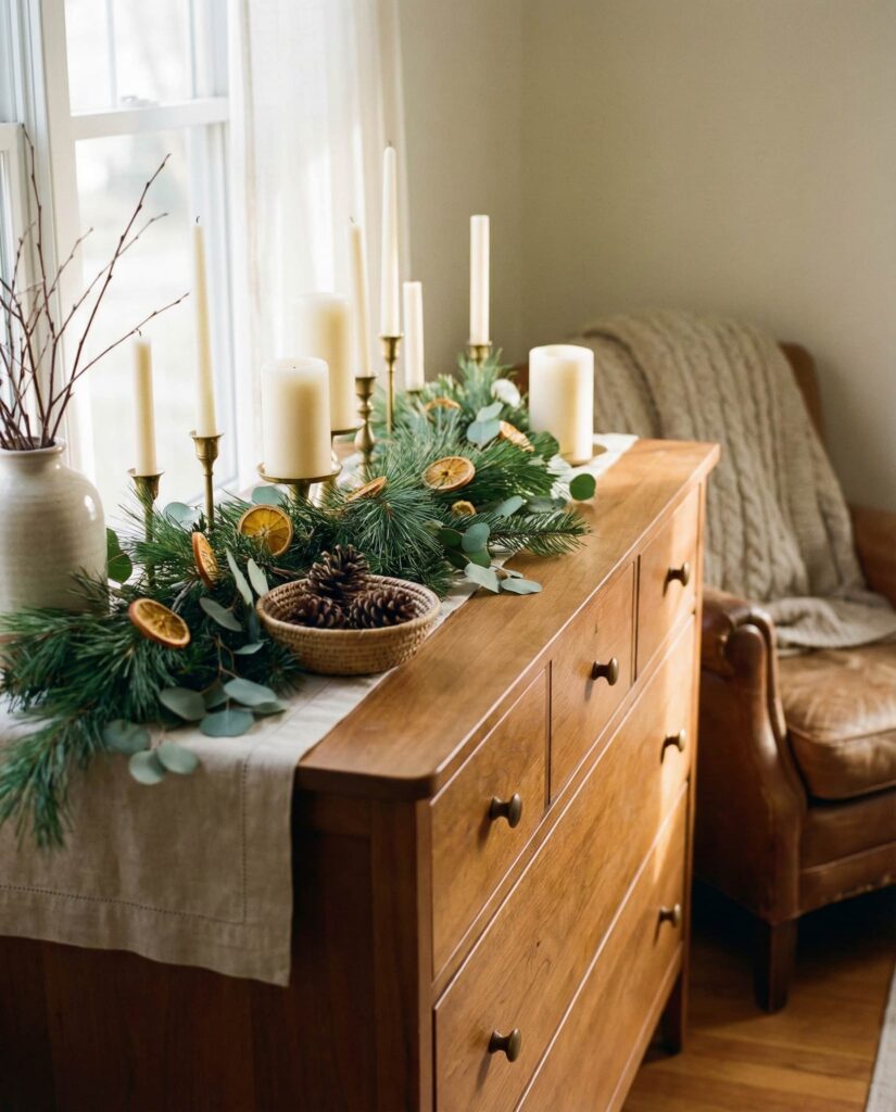 Thoughtful Christmas styling on a dresser doesn’t have to feel temporary. The Top of the dresser can feature winter greenery, neutral candles, and timeless objects that still work after the season ends. I’ve seen homeowners appreciate decor that transitions smoothly back into everyday life. These dresser decoration ideas respect both celebration and simplicity, offering festive inspo that feels mature, calm, and easy to live with.