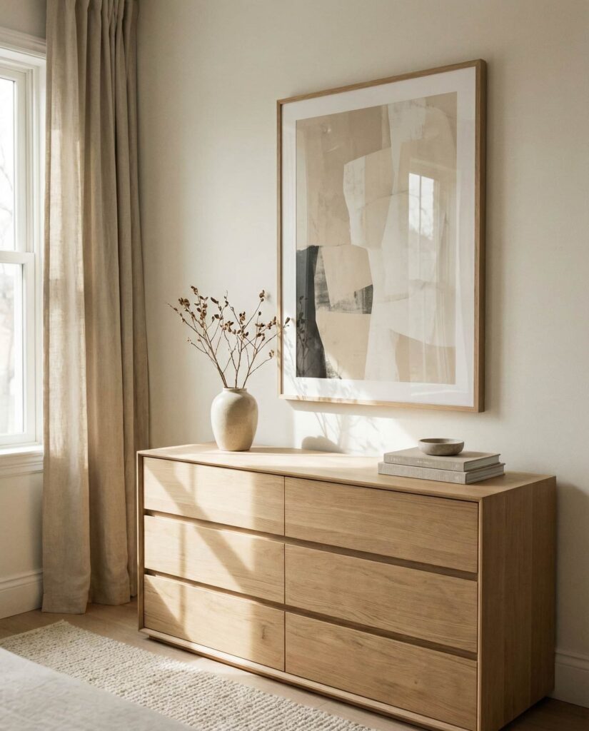 An Aesthetic approach to dresser decoration often starts by treating the Top of the dresser as a quiet base and letting what’s placed Above it do the expressive work. In a calm Bedroom, this usually means leaning or hanging a piece of art, photography, or a small gallery that sets the emotional tone of the space. I’ve noticed this idea resonates with people who care deeply about Bedroom aesthetic but don’t want excessive objects on surfaces. A neutral White or Black dresser works well here, keeping attention on the artwork while the surface holds only essentials like a lamp or tray. These dresser decoration ideas feel thoughtful and grown-up, offering subtle inspiration that reflects personal taste without visual noise.