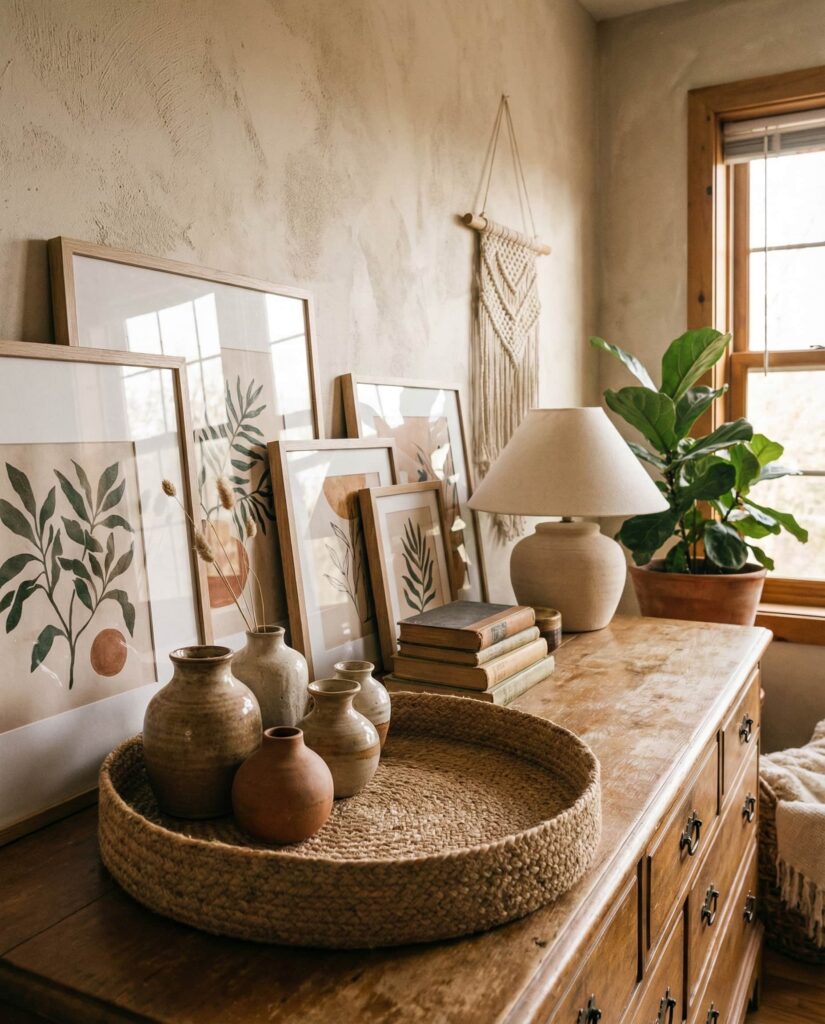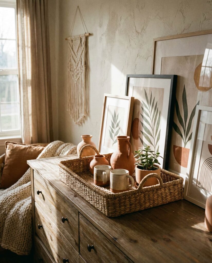 A Boho approach to dresser styling thrives on texture and individuality. In a relaxed Bedroom, the Top of the dresser often features woven trays, ceramic vessels, and layered artwork leaning casually against the wall. I’ve noticed people gravitate toward this style when they want their space to feel lived-in rather than styled. Earthy tones and handcrafted objects soften even modern furniture, making this one of the most adaptable dresser decoration ideas available. It works beautifully in eclectic apartments or homes where creativity takes priority over symmetry. These Ideas feel personal, expressive, and endlessly adjustable, offering ongoing inspo as collections grow and change over time.