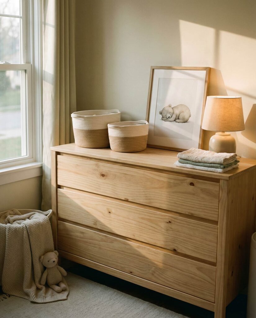 In a Nursery, safety and softness guide every decision, including the Top of the dresser. I’ve observed parents favor minimal dresser decoration here—soft baskets, framed name art, or a gentle night light—keeping the surface calm and functional. Neutral colors work well as the child grows, allowing easy updates without replacing furniture. These Ideas balance design with practicality, proving that thoughtful styling doesn’t have to be complicated. A well-considered nursery dresser feels reassuring and intentional, offering quiet inspo during a season of constant change.