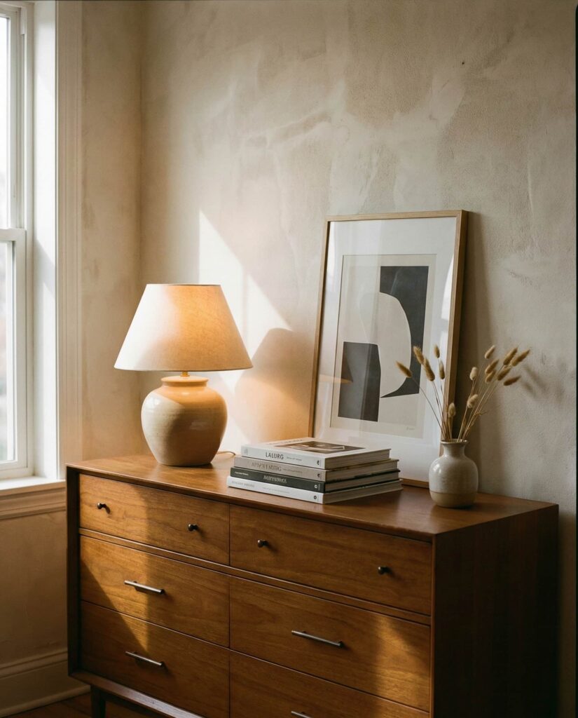 Farmhouse style dresser decor is grounded in comfort and familiarity. In a cozy Bedroom, the Top of a wooden dresser often holds a table lamp, greenery, and a simple framed print. I’ve seen this style resonate strongly with families who want their homes to feel welcoming rather than precious. Neutral palettes and natural materials keep the look timeless and approachable. These dresser decoration ideas are especially popular in suburban homes where function and warmth matter most. The result is a surface that feels finished but never overdone, offering steady inspiration without demanding constant updates.