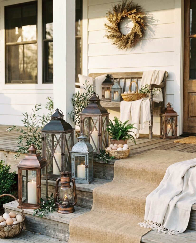 This Outdoor Easter porch concept for 2026 reimagines classic Farmhouse styling through layered lantern arrangements that feel both seasonal and timeless. The idea works especially well for wide front porches or entry steps, where groups of lanterns in varying heights create depth and warmth. Using Neutral finishes, aged metal, and subtle Rustic details, the look blends seamlessly with Outdoor farmhouse architecture. Inside the lanterns, simple elements like greenery, faux candles, or restrained Easter accents hint at the holiday without overwhelming the space. This approach reflects advice often shared by editors at Better Homes & Gardens, who emphasize layering light sources to make an entry feel welcoming. It’s an Easy solution that balances Simple design with Elegant charm, transitioning beautifully from early Spring through the rest of the season.
