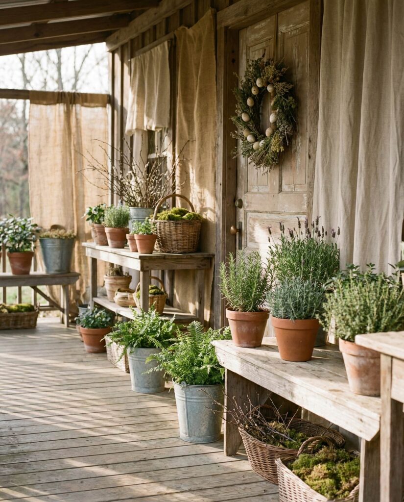This Outdoor rustic Easter porch idea for 2026 centers on greenery as the main decorative statement. Instead of relying on themed objects, it uses potted herbs, eucalyptus branches, and moss-filled containers to create a fresh Spring mood. The look feels grounded and organic, ideal for front porches that already feature stone or Wooden elements. By keeping the palette Neutral and materials natural, the decor blends seamlessly into the home’s exterior. Editors at Gardenista often note that greenery-driven styling feels timeless and calming, making this approach both practical and visually appealing for everyday living.