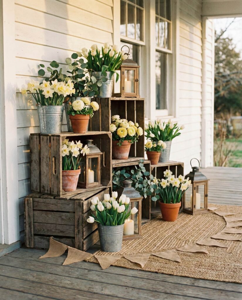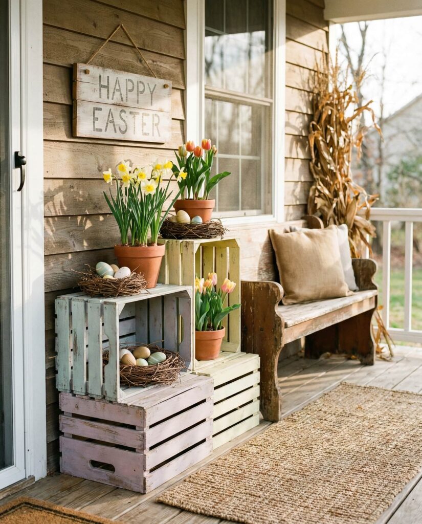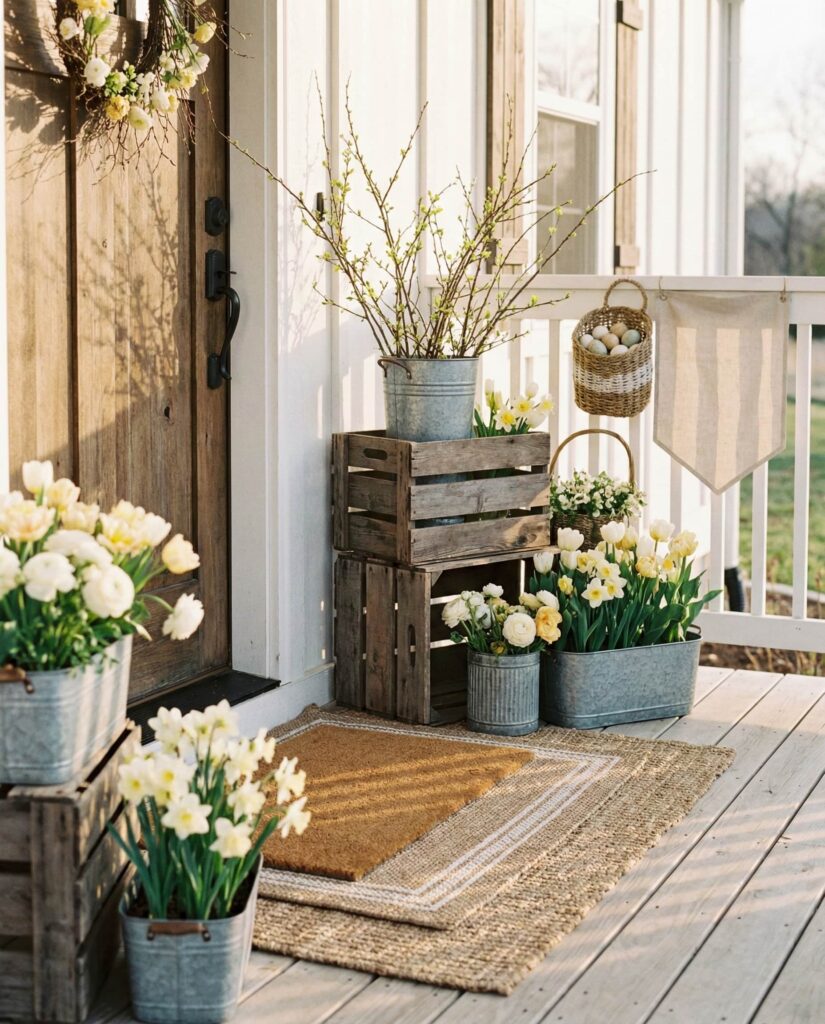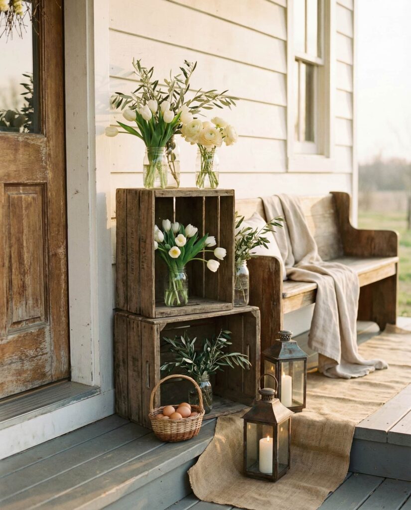 This Outdoor farmhouse Easter idea uses stacked wooden crates as a flexible display solution. Filled with seasonal flowers, faux eggs, or lanterns, the crates add height and structure to the porch. In 2026, homeowners favor practical decor that can be reused year-round, and crate displays fit that mindset perfectly. The Farmhouse feel is casual and welcoming, especially when paired with muted Spring colors. Lifestyle editors often recommend crate styling for its adaptability, making it a smart investment for changing seasons.